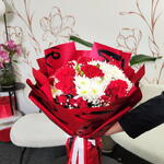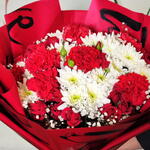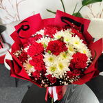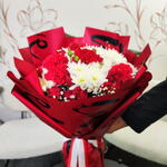Un bouquet noué à la main saisissant qui équilibre passion et pureté. Des œillets rouges vifs et des roses rouges classiques symbolisent l'amour profond et l'admiration, le tout magnifiquement contrasté par de frais chrysanthèmes blancs qui ajoutent une touche de sincérité et de sérénité. De délicats brins de gypsophile adoucissent l'ensemble, tandis que l'emballage rouge dramatique accentue son caractère romantique et festif. Parfait pour les anniversaires, la Saint-Valentin, ou tout moment destiné à dire « vous comptez vraiment. » ❤️🌹