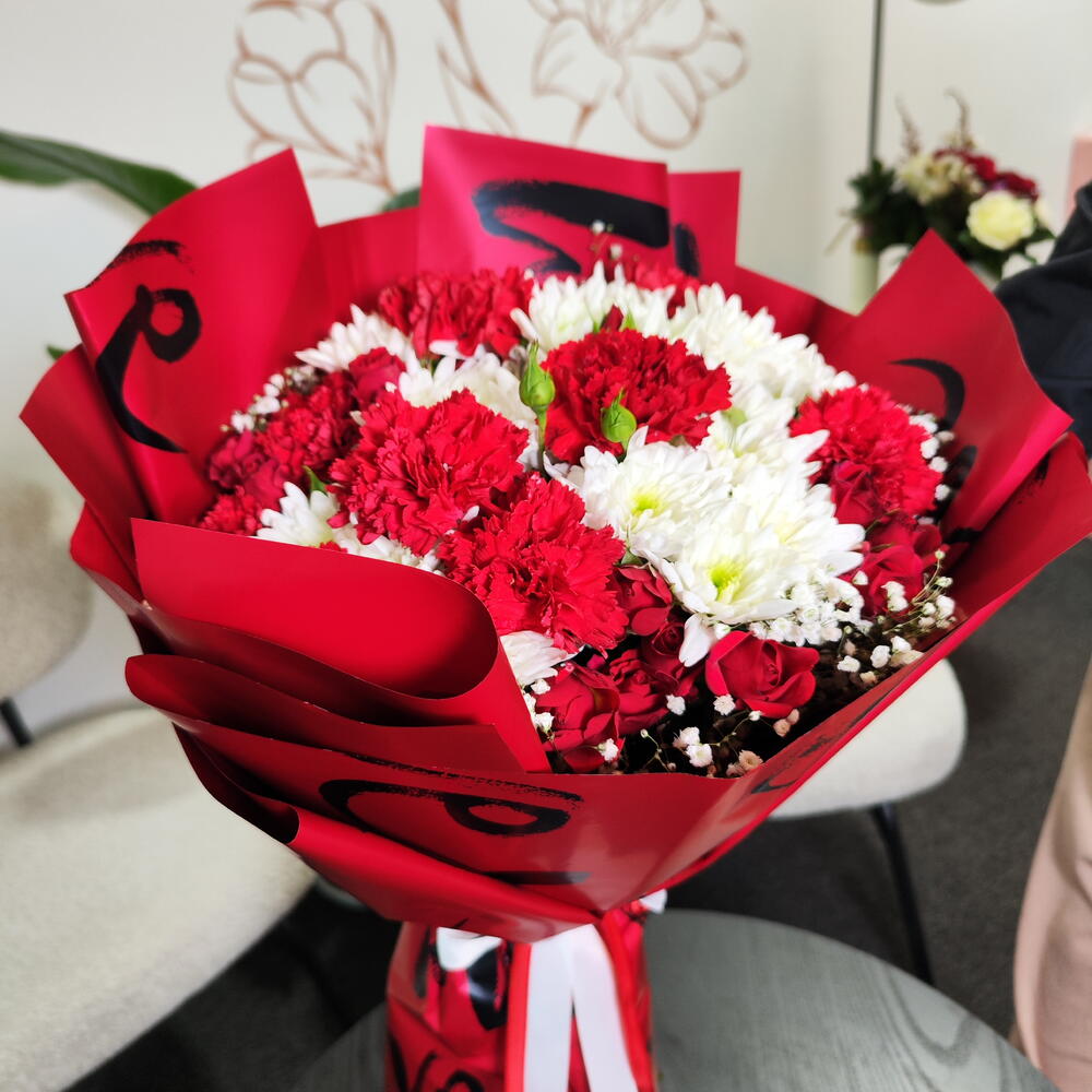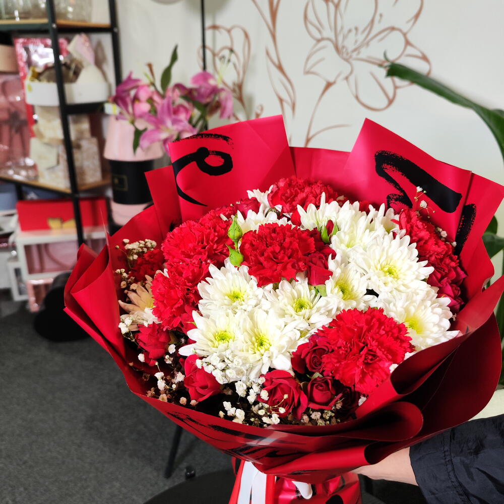Un bouquet noué à la main saisissant qui équilibre passion et pureté. Des œillets rouges vifs et des roses rouges classiques symbolisent l'amour profond et l'admiration, le tout magnifiquement contrasté par de frais chrysanthèmes blancs qui ajoutent une touche de sincérité et de sérénité. De délicats brins de gypsophile adoucissent l'ensemble, tandis que l'emballage rouge dramatique accentue son caractère romantique et festif. Parfait pour les anniversaires, la Saint-Valentin, ou tout moment destiné à dire « vous comptez vraiment. » ❤️🌹