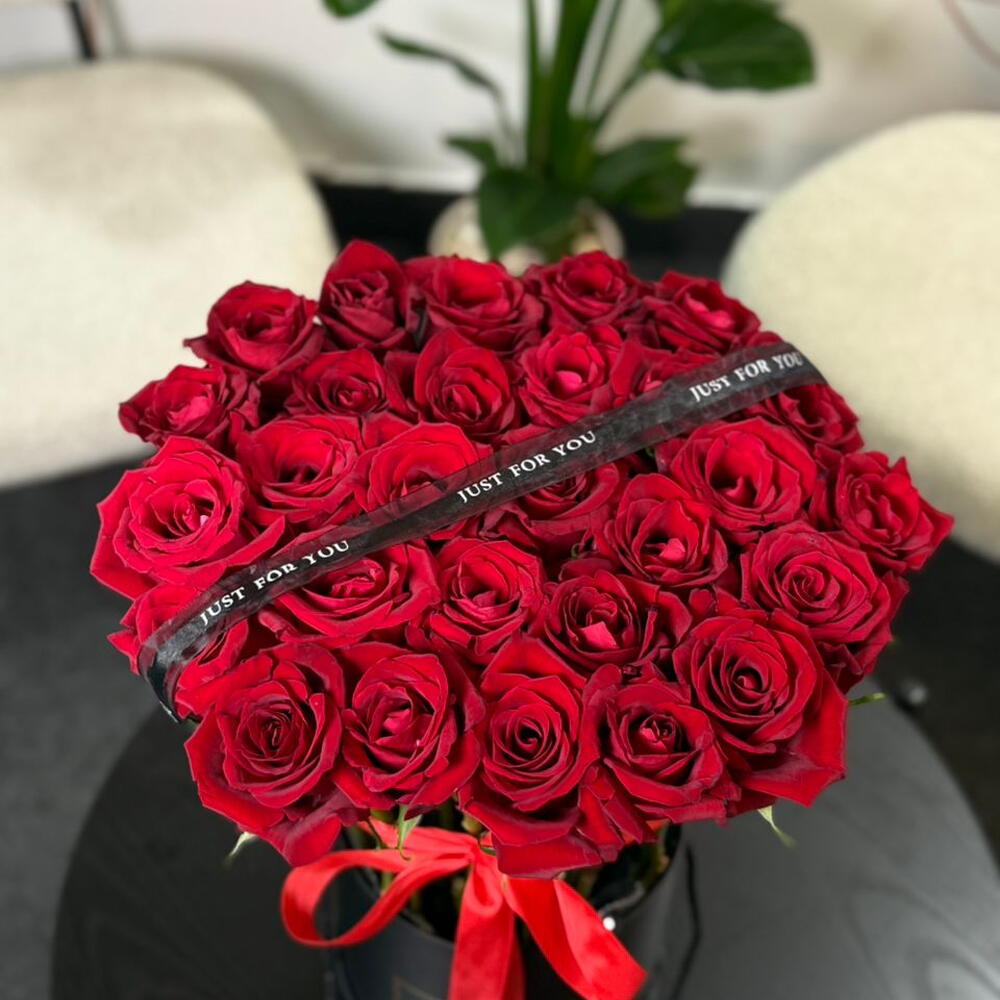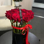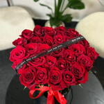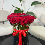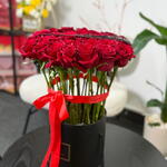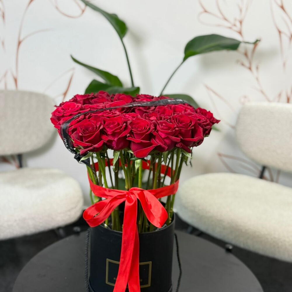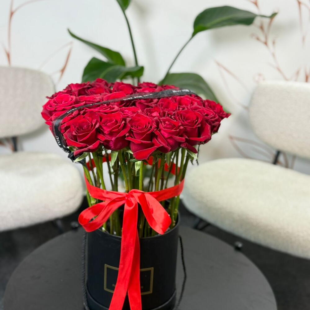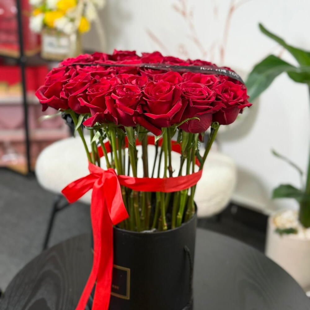 Une composition luxueuse dans une boîte à chapeau, remplie de roses rouges intenses, serrées pour un rendu plein et élégant. Présentée dans une boîte noire élégante, ornée d'un ruban rouge vif, cette création dégage passion, romantisme et sophistication — parfaite pour les anniversaires, la Saint‑Valentin ou pour faire une déclaration romantique inoubliable. 🌹🖤❤️