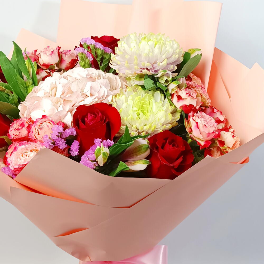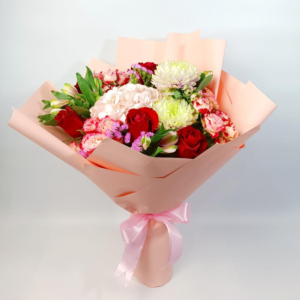 rose rouge - 5 pce hydrangea pink - 1 pce statice rose - 3 pce chrysanthemum green - 2 pce alstroemeria pink - 3 pce spray de roses sunset - 3 pce
