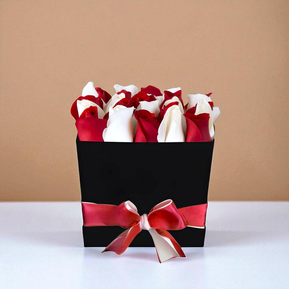 Présentant un superbe arrangement de 15 roses rouges éclatantes et de 10 roses blanches immaculées, joliment nichées dans une élégante boîte noire. Cette luxueuse boîte florale réserve en outre une douce surprise avec 8 pièces de chocolats décadents. Un régal exquis pour les sens, c'est le cadeau parfait pour toute occasion spéciale.