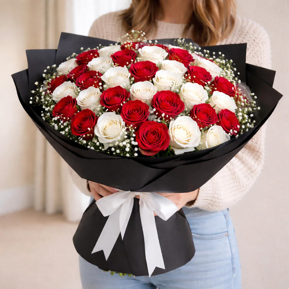 This bouquet features a large number of premium red and white roses carefully packed in a dome shape for a full and impressive look. 50 Big Size Premium Red Roses Contains a generous quantity of fresh red roses for a dense and luxurious appearance with 1 color. Wrapped in thick, layered black paper that enhances the volume and impact of the bouquet.