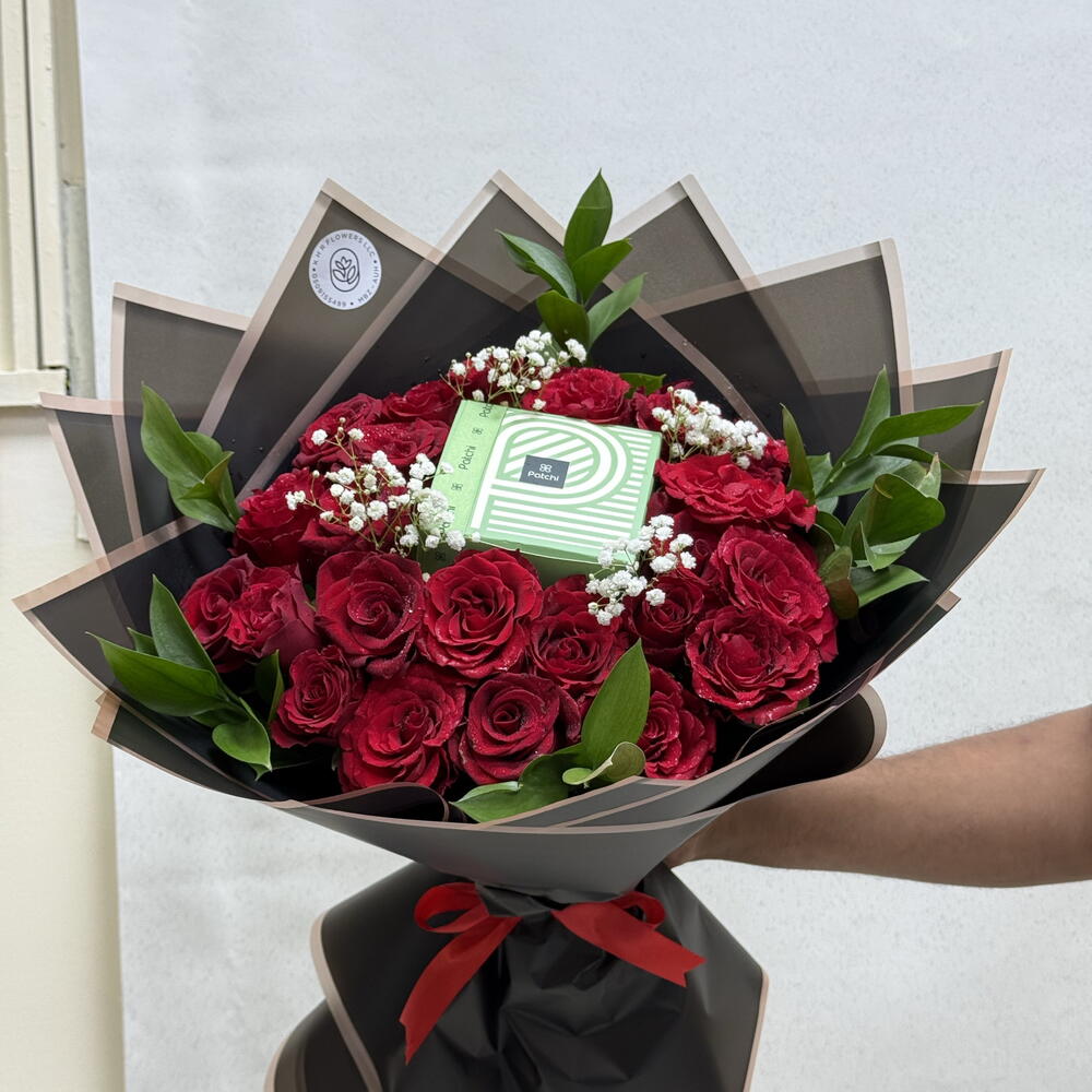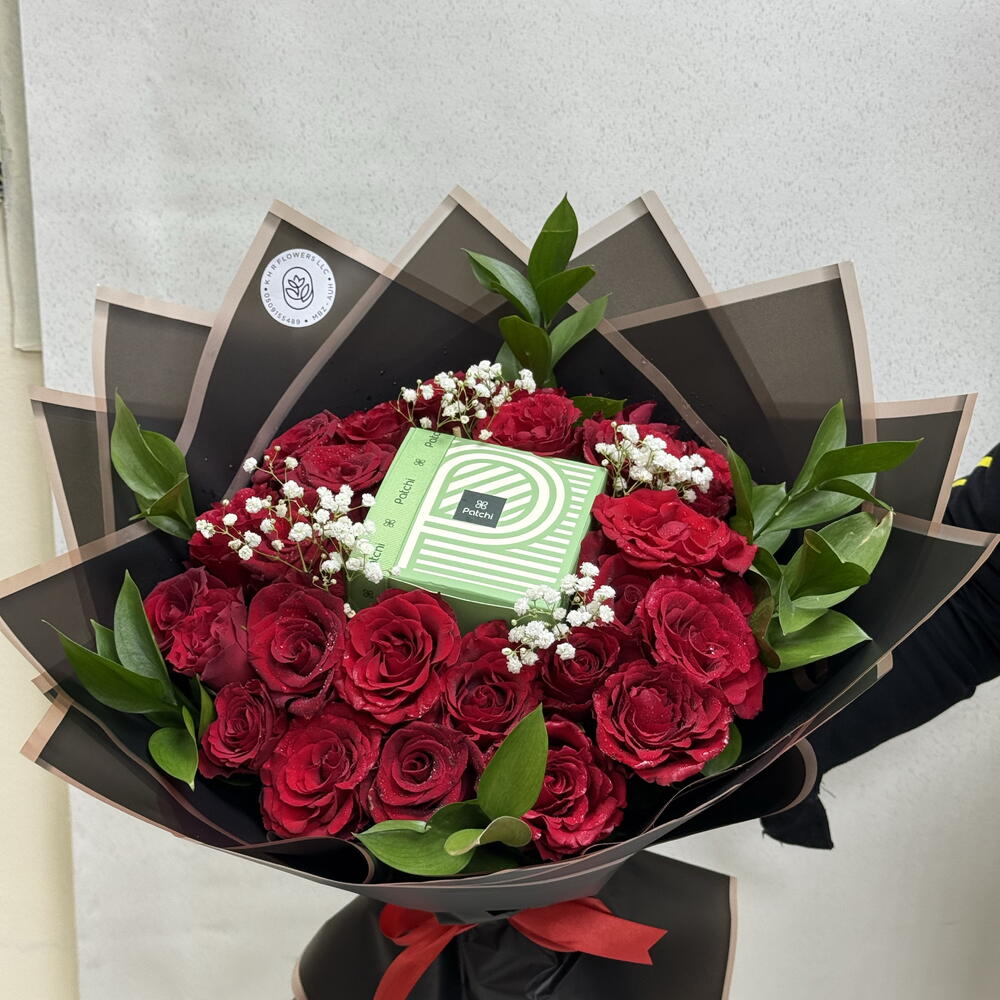 tiges individuelles de ruscus - 5 pce Boîte Patchi 250 g - 1 pce tiges de roses rouges - 20 pce
