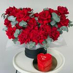 Faites plaisir à vos sens avec cet exquis bouquet mono, composé de 61 roses rouges classiques cueillies à la main, une superbe expression d'amour et de passion. Agrémenté de 10 feuilles d'eucalyptus élégantes, cet arrangement laissera à coup sûr une impression inoubliable. Nichée au cœur de ce magnifique bouquet se trouve une délicieuse surprise : un unique gâteau bento en forme de cœur rouge, délicatement conçu pour satisfaire vos envies sucrées. Le tout présenté avec soin dans une élégante boîte noire, ce bouquet exprime pleinement vos sentiments et constitue un choix idéal pour transmettre vos messages du cœur.