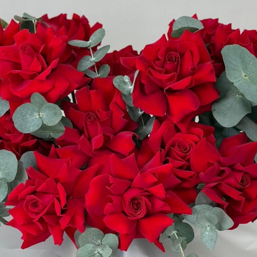 Faites plaisir à vos sens avec cet exquis bouquet mono, composé de 61 roses rouges classiques cueillies à la main, une superbe expression d'amour et de passion. Agrémenté de 10 feuilles d'eucalyptus élégantes, cet arrangement laissera à coup sûr une impression inoubliable. Nichée au cœur de ce magnifique bouquet se trouve une délicieuse surprise : un unique gâteau bento en forme de cœur rouge, délicatement conçu pour satisfaire vos envies sucrées. Le tout présenté avec soin dans une élégante boîte noire, ce bouquet exprime pleinement vos sentiments et constitue un choix idéal pour transmettre vos messages du cœur.