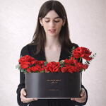 Déclaration audacieuse d'amour, la Red Fever Love Box est conçue pour s'adresser directement au cœur. Composée d'un mélange intense de 3 roses rouges, 4 roses spray rouges et 5 branches d'eucalyptus, cette composition saisissante incarne la passion, le désir et la profondeur émotionnelle. Présentée dans la grande boîte ovale noire « You Are My World », les fleurs rouges flamboyantes s'élèvent avec confiance et élégance, créant une déclaration dramatique pour la Saint-Valentin, puissante, intime et inoubliable.