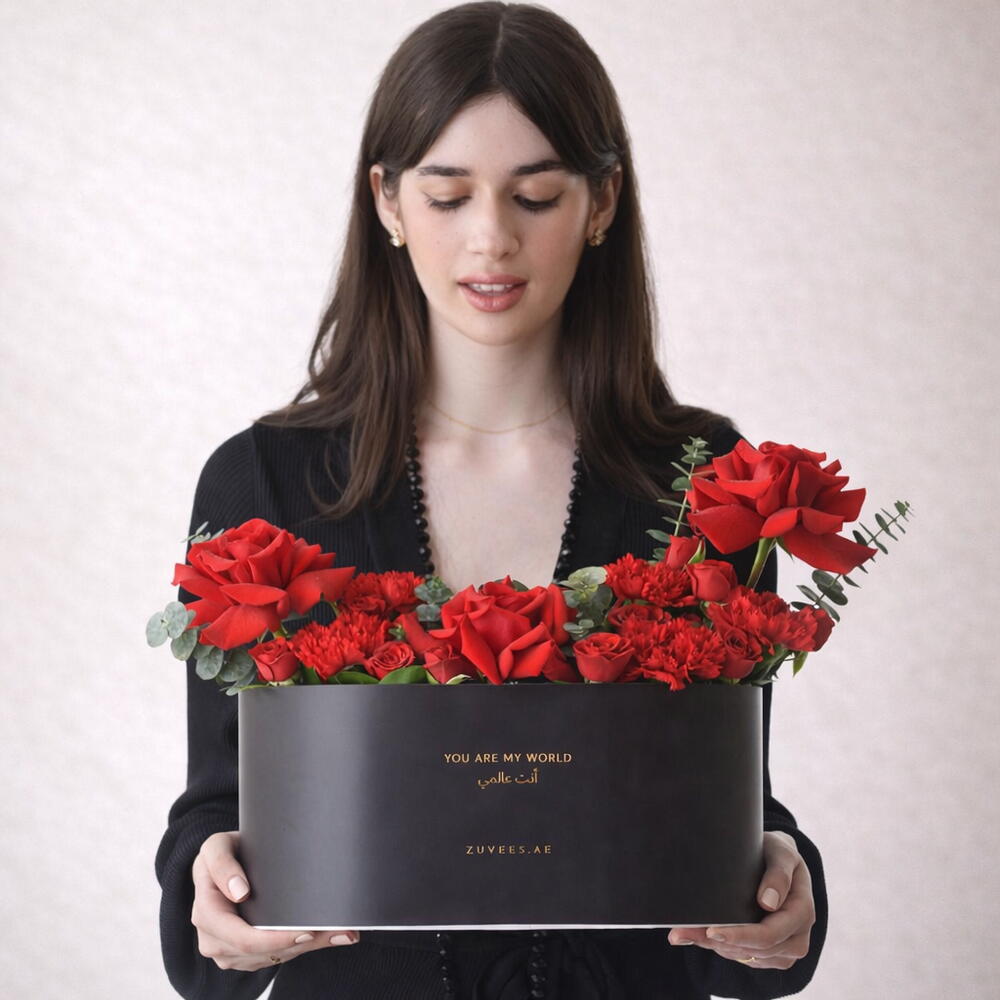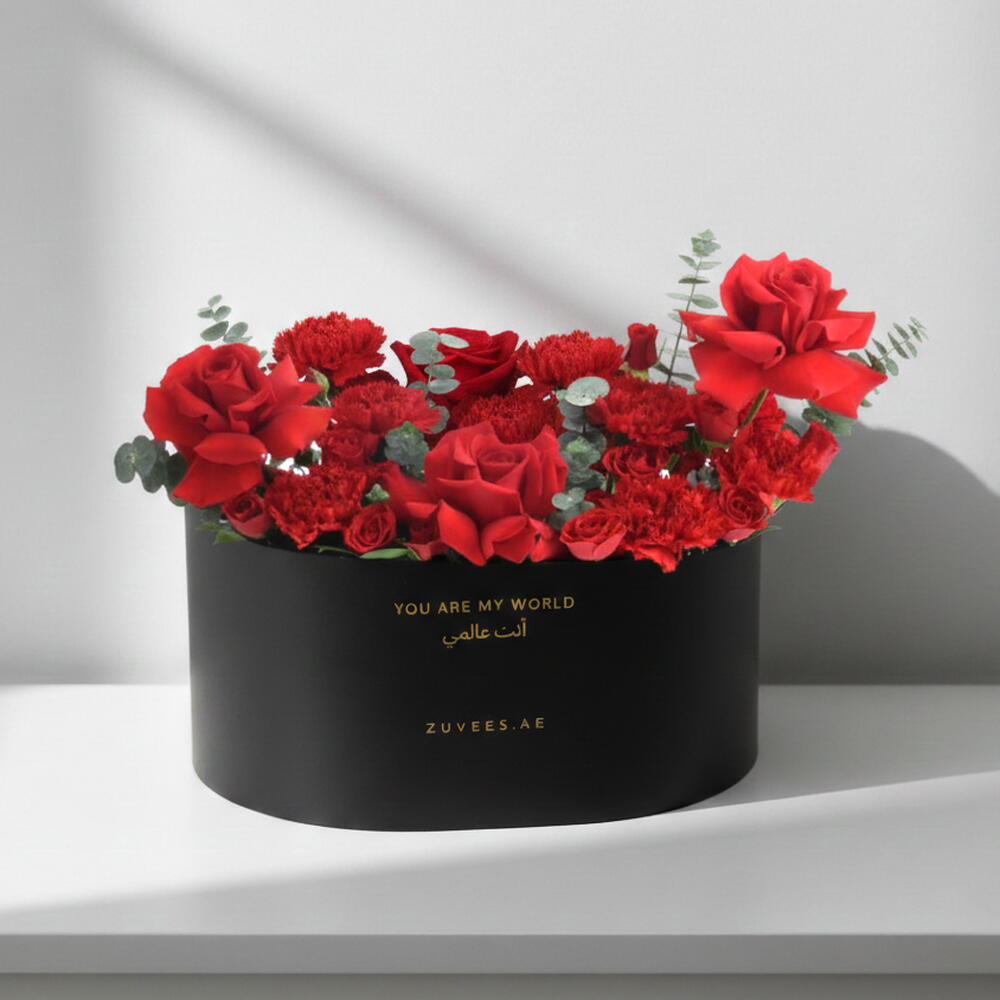Déclaration audacieuse d'amour, la Red Fever Love Box est conçue pour s'adresser directement au cœur. Composée d'un mélange intense de 3 roses rouges, 4 roses spray rouges et 5 branches d'eucalyptus, cette composition saisissante incarne la passion, le désir et la profondeur émotionnelle. Présentée dans la grande boîte ovale noire « You Are My World », les fleurs rouges flamboyantes s'élèvent avec confiance et élégance, créant une déclaration dramatique pour la Saint-Valentin, puissante, intime et inoubliable.