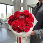 Bouquet de fleurs rouges avec des roses en emballage blanc 19 pièces