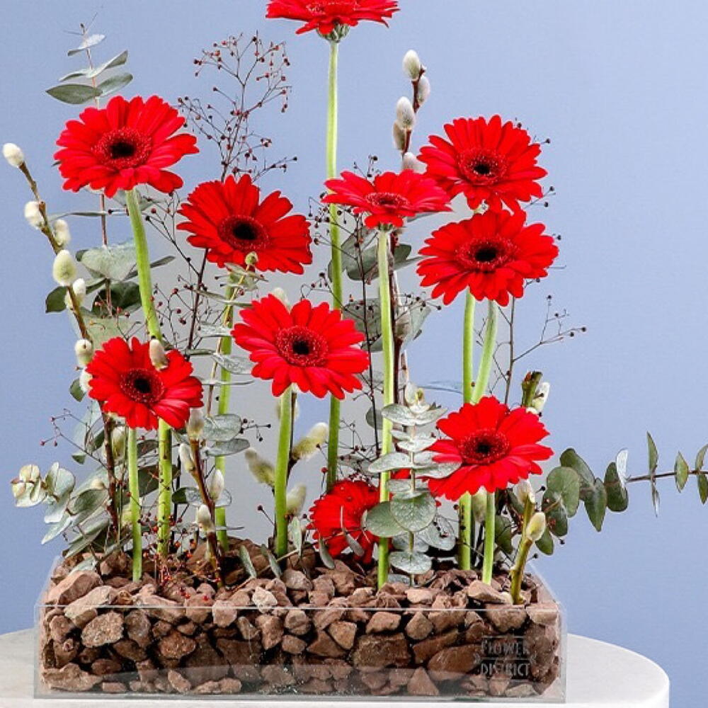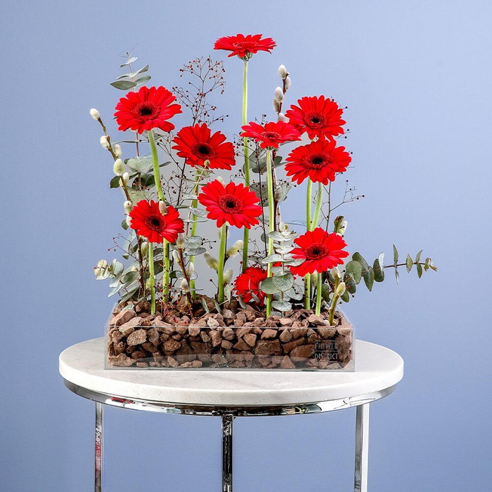 Une composition florale vibrante et moderne mettant en valeur de saisissantes gerberas rouges disposées à différentes hauteurs dans une élégante jardinière rectangulaire en verre.