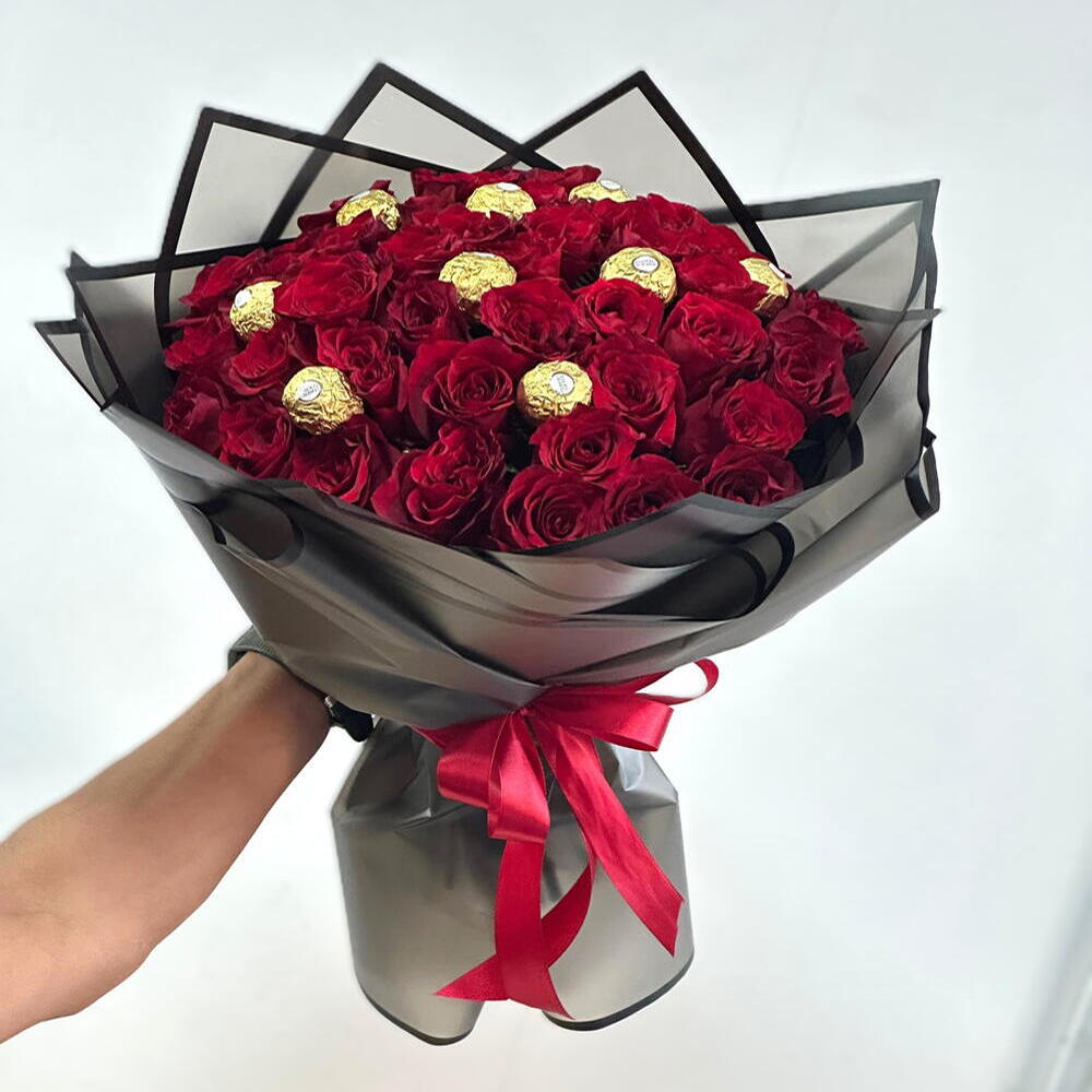 Un beau bouquet de 41 tiges de roses rouges et 9 pièces de chocolat Ferrero Rocher