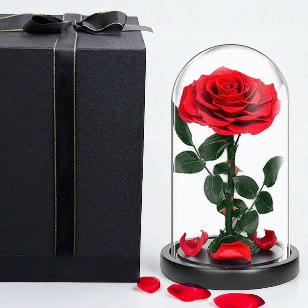 Découvrez l'élégance intemporelle avec cette rose rouge préservée sous une cloche en verre, inspirée des contes de fées classiques. La rose unique, parfaitement épanouie, repose gracieusement sur une base en bois noir, enfermée dans une cloche d'une clarté cristalline pour protéger sa délicate beauté. Symbole d'amour éternel et d'admiration, cette fleur préservée constitue un cadeau inoubliable pour les anniversaires, les fêtes d'anniversaire ou les moments particuliers. Emballée dans une boîte cadeau noire et sophistiquée avec un ruban, elle est prête à impressionner dès sa réception. La véritable rose est traitée pour durer des années sans eau ni lumière du soleil. Conservez-la dans un endroit frais et sec et évitez l'exposition directe au soleil et l'humidité pour une meilleure conservation.