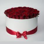 Un arrangement exquis de 35 roses rouges présenté dans une boîte blanche immaculée. Ce contraste saisissant entre le cramoisi profond et le blanc pur dégage une élégance intemporelle, une passion et une sophistication — une expression royale d'amour et d'admiration, parfaite pour les occasions les plus mémorables.