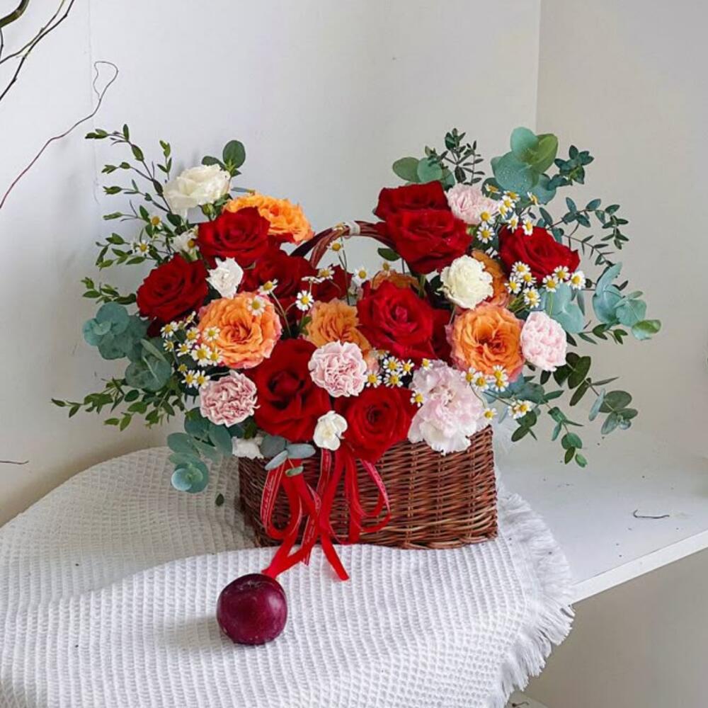 Basket - 1 pce carnation pink - 5 pce orange rose - 6 pce red roses - 10 pce feuille d'eucalyptus - 4 pce