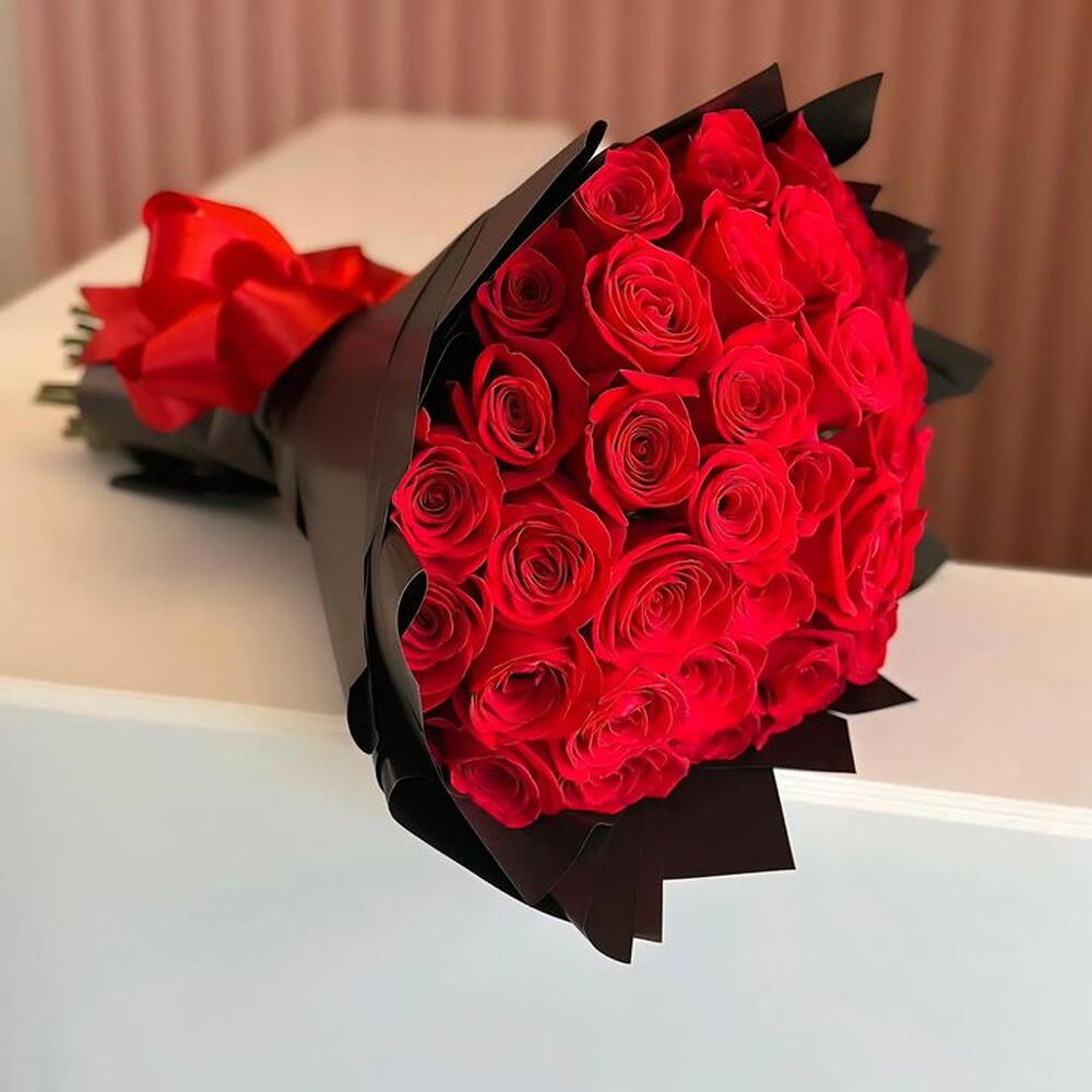 Un bouquet élégant et luxueux de roses rouges éclatantes, serrées et disposées dans un papier noir brillant, terminé par un ruban rouge audacieux qui ressort sur les bords noirs chics, lui donnant une ambiance romantique moderne et dramatique.