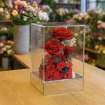 Mélange de fleurs rouges dans un dôme en cristal de haute qualité. Pour Toujours