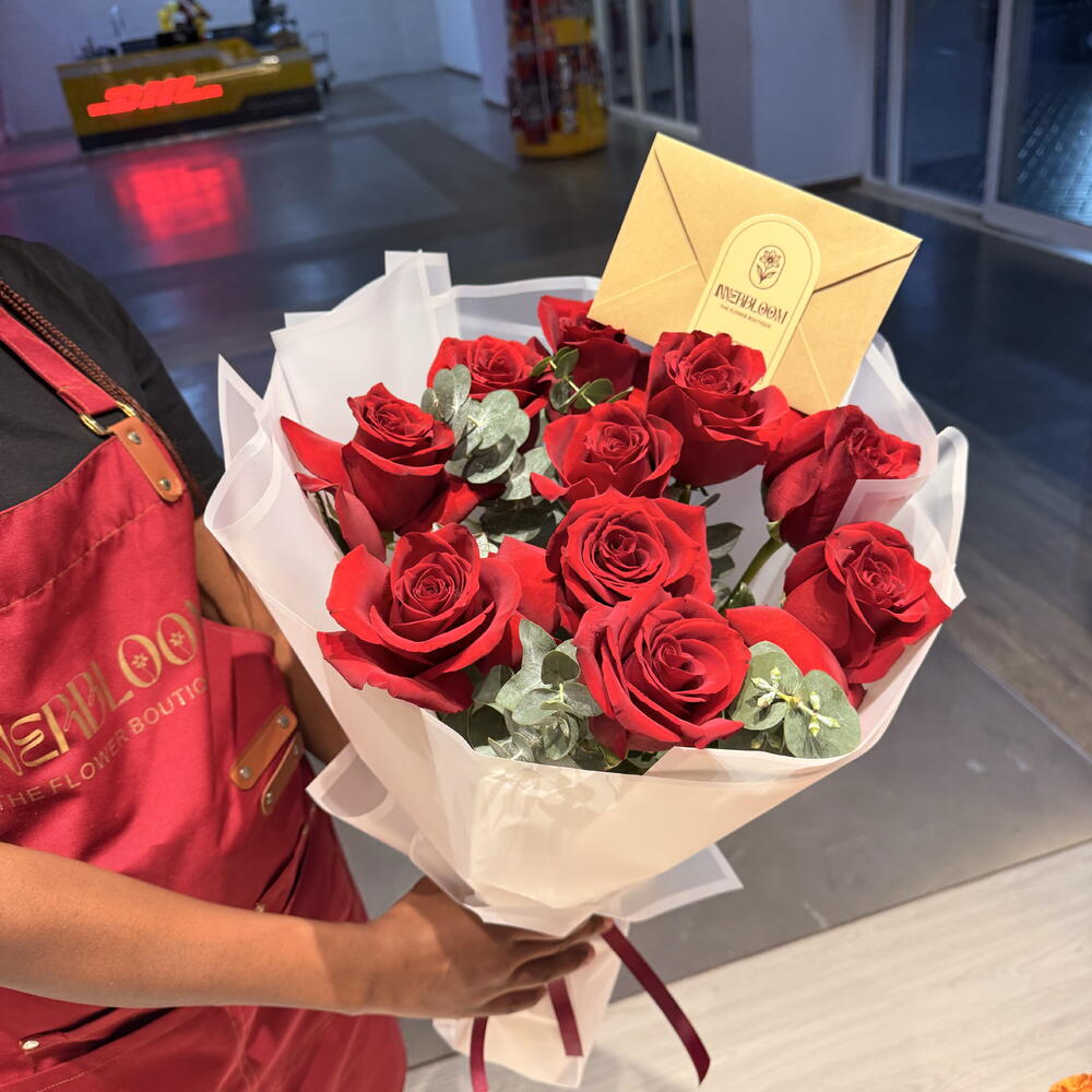 Découvrez le charme envoûtant de notre Mono Bouquet, habilement arrangé avec dix roses opulentes, huit feuilles d'eucalyptus luxuriantes et huit feuilles délicates de ruscus. Chaque bouquet est solidement enveloppé avec six pièces d'emballage de qualité, assurant une présentation éblouissante. Incarnation de l'élégance et du charme, ce bouquet est parfait pour rendre toute occasion mémorable.