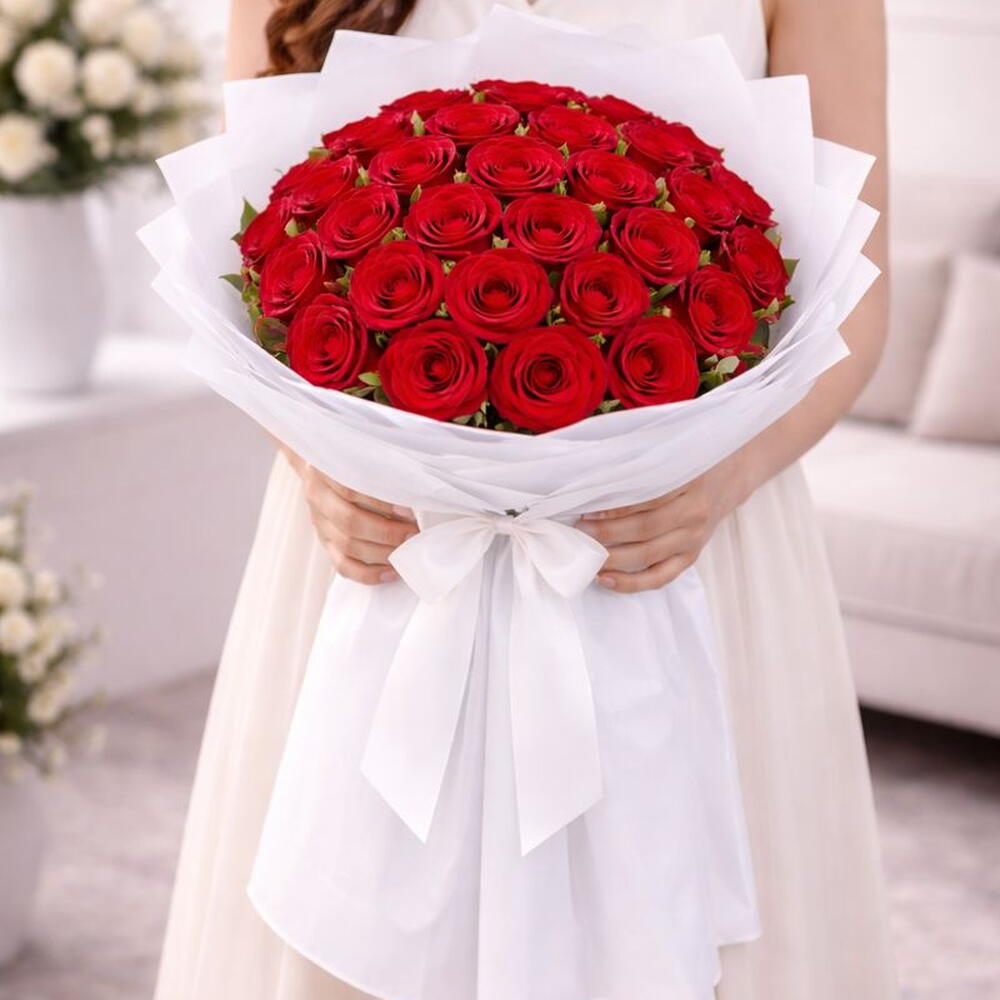 24 roses rouges fraîches élégamment présentées dans un emballage blanc haut de gamme avec un beau ruban. Ce bouquet classique, passionné et romantique, est le cadeau parfait pour exprimer l'amour lors de demandes en mariage, d'anniversaires et de célébrations spéciales.