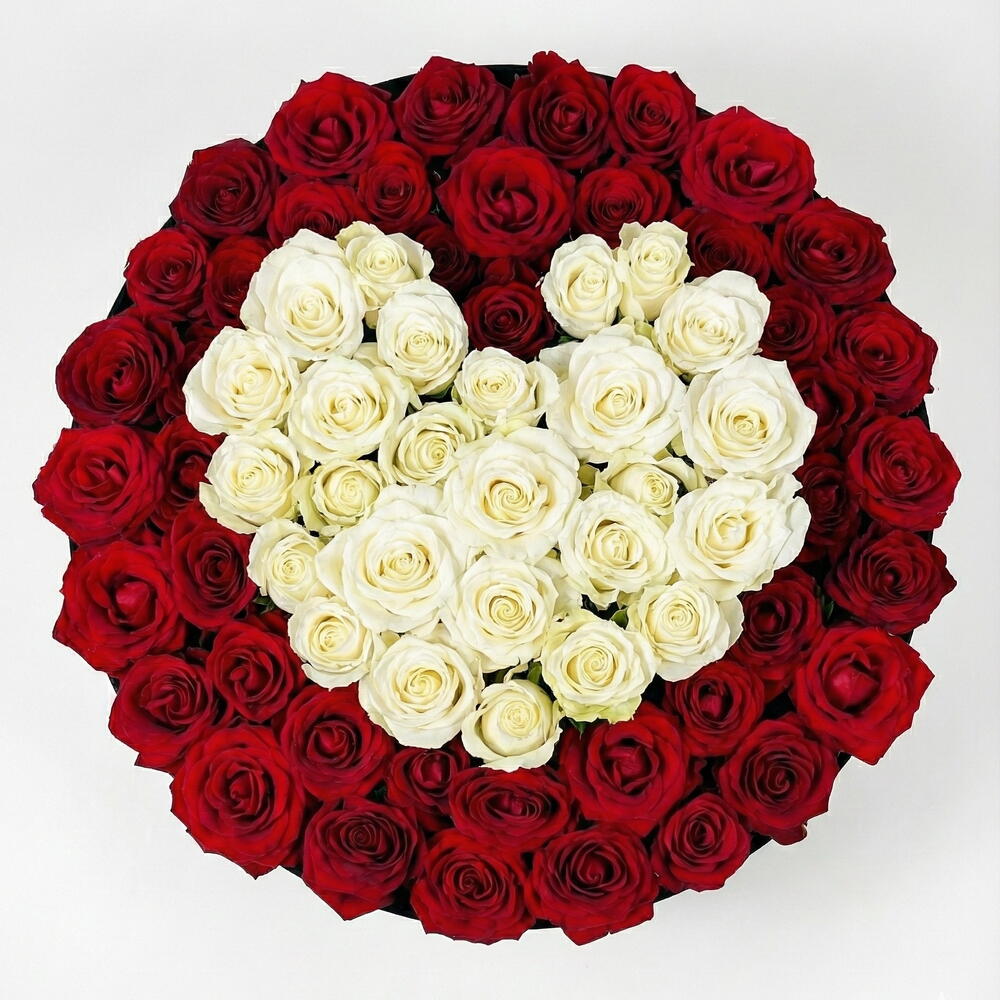 Exprimez l'amour sous sa forme la plus élégante avec cette somptueuse boîte de roses rouges présentant un motif de cœur blanc, magnifiquement composée de 99 roses fraîches de qualité supérieure. De riches roses rouges forment une couche extérieure audacieuse, tandis que de délicates roses blanches au centre créent un cœur parfaitement façonné — symbolisant l'amour pur, la sincérité et une profonde émotion. Présentée dans une luxueuse boîte ronde en velours noir, cette composition est réalisée à la main jusqu'à la perfection, assurant un rendu plein, symétrique et raffiné. Le contraste saisissant des roses rouges et blanches sur la boîte noire confère à cette pièce un attrait intemporel et haut de gamme, en faisant un cadeau romantique inoubliable. Parfaite pour la Saint-Valentin, les anniversaires, les demandes en mariage, les fêtes d'anniversaire ou les surprises romantiques de luxe, cette boîte de 99 roses est conçue pour laisser une impression durable. Chaque rose est soigneusement sélectionnée pour sa fraîcheur et sa qualité, offrant une beauté durable et une expérience de cadeau véritablement haut de gamme. Détails du produit: • Nombre total de roses: 99 roses fraîches • Couleurs des fleurs: Roses rouges avec cœur de roses blanches • Design: Élément central en forme de cœur • Type de boîte: Boîte ronde en velours noir de luxe • Style: Élégant, romantique, composition haut de gamme • Idéal pour: la Saint-Valentin, les demandes en mariage, les anniversaires, les cadeaux romantiques Une boîte intemporelle de roses rouges qui exprime l'amour, la passion et l'élégance—parfaite pour les moments qui comptent le plus.