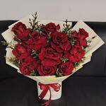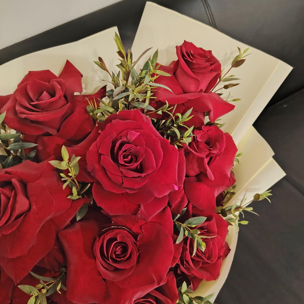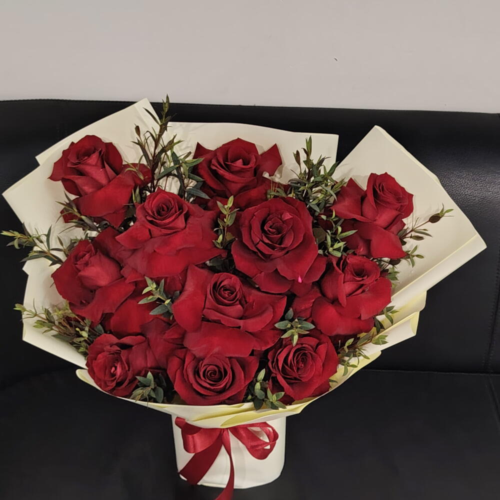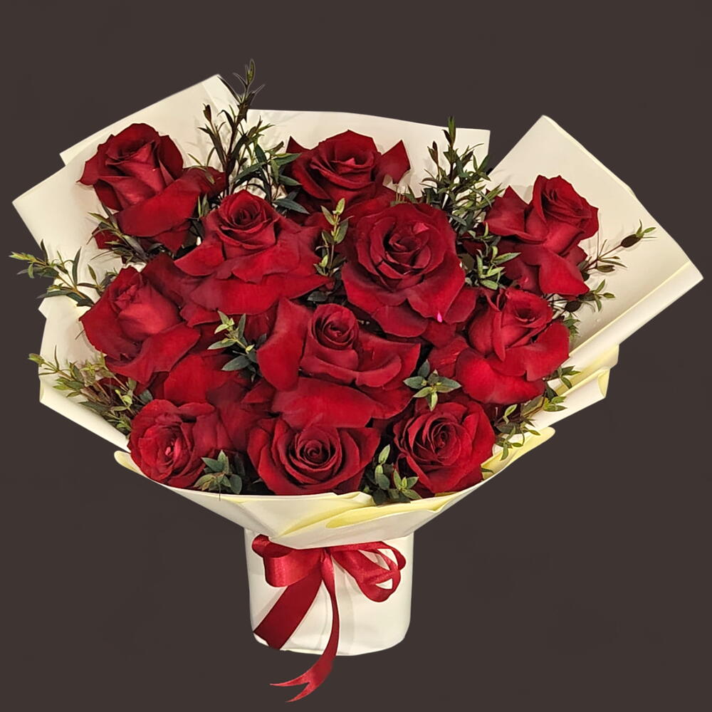 Roses fraîches à grosses têtes avec une touche de verdure, magnifiquement emballées.