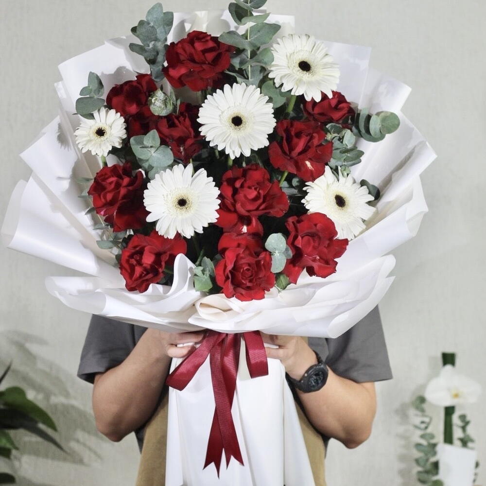 Spécialement conçu pour les amateurs de fleurs, ce Florists Special, méticuleusement composé, comprend 10 roses éclatantes qui apportent une touche d'élégance à tout bouquet, 5 magnifiques gérberas blancs ajoutant fraîcheur et pureté, et 5 branches d'eucalyptus raffinées renforçant l'aspect luxueux. De plus, l'ensemble est complété par 10 feuilles de papier d'emballage de haute qualité pour présenter magnifiquement ce mélange angélique de fleurs. Que ce soit pour une occasion spéciale ou simplement pour surprendre un être cher, cette sélection est garantie d'impressionner.