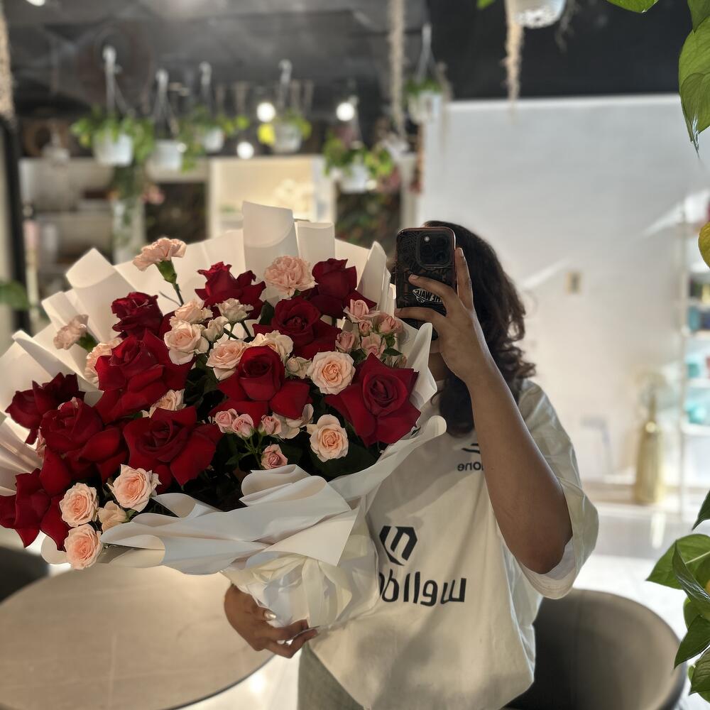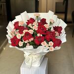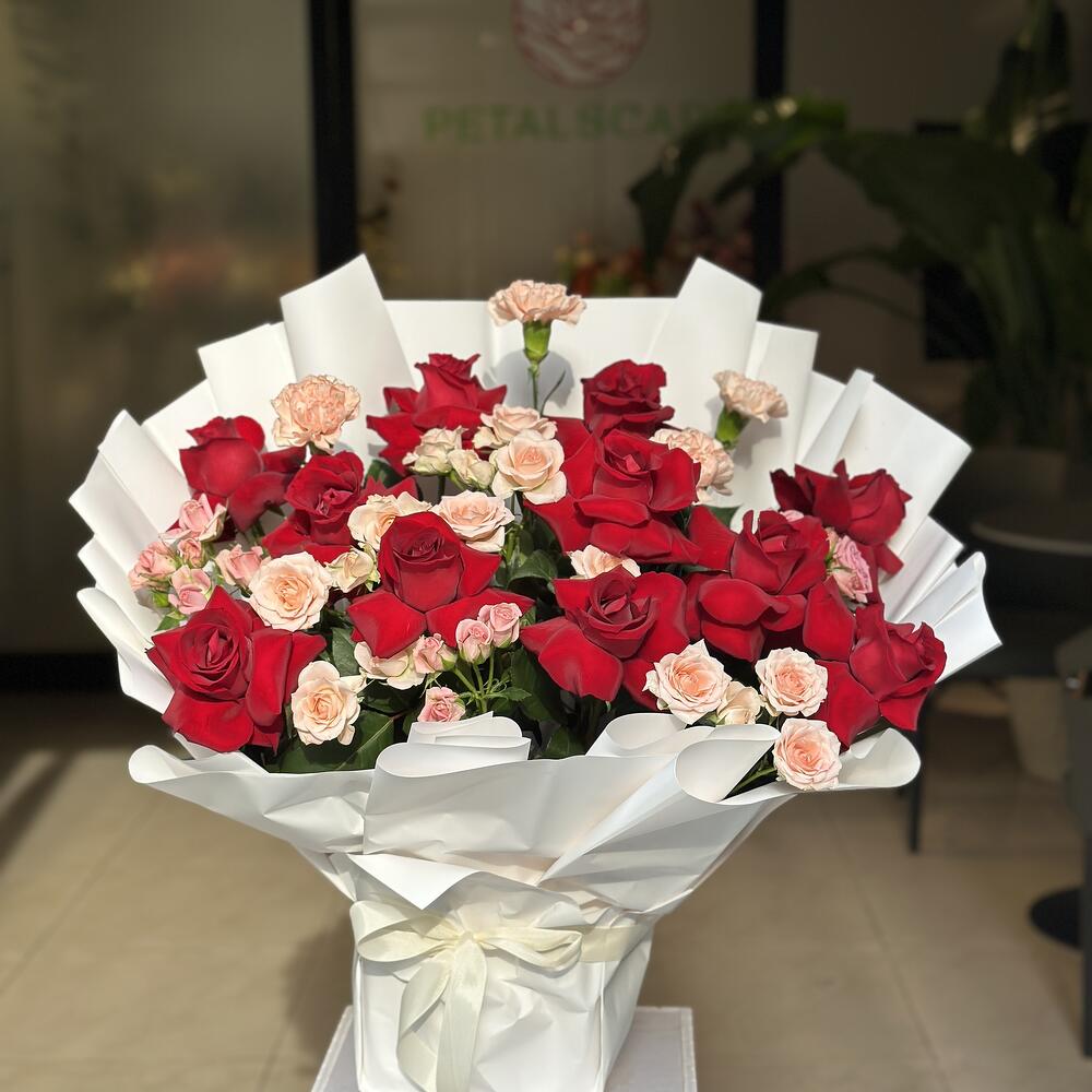 Laissez-vous séduire par la beauté captivante de notre composition Florists Specials, comprenant une sélection époustouflante de 12 roses rouges immaculées, accompagnées de 4 œillets couleur pêche qui apportent une subtile touche de couleur. Complétant le bouquet, les 7 roses couleur pêche ajoutent une touche contemporaine au bouquet. Parfait pour exprimer l'amour, l'admiration ou simplement pour apporter un sourire aux visages de vos proches avec ce chef-d'œuvre !