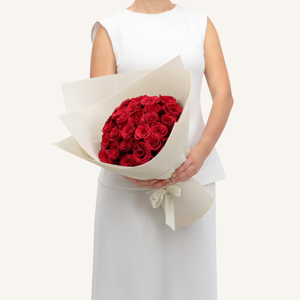 Surprenez l'être aimé pour la Saint-Valentin avec un élégant bouquet de roses rouges. - 25 roses rouges de qualité supérieure. - Hauteur : 60 cm, largeur : 30 cm
