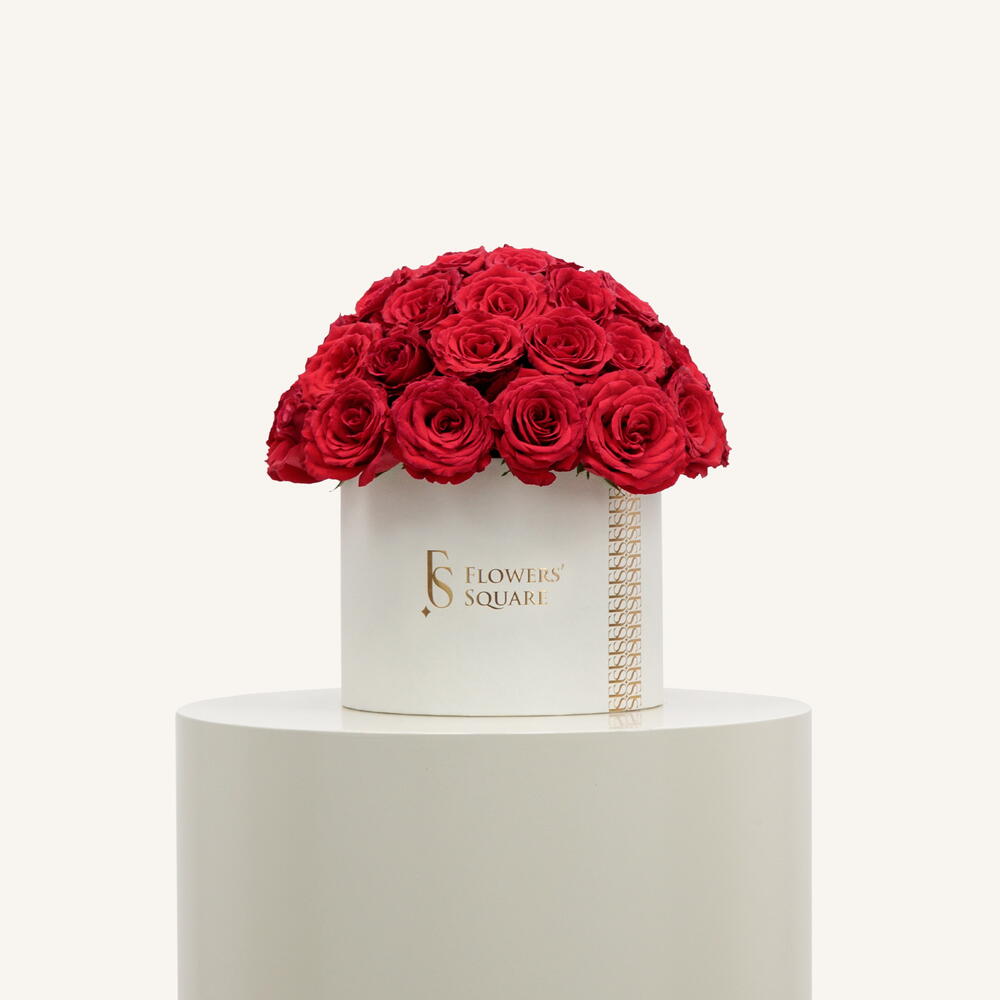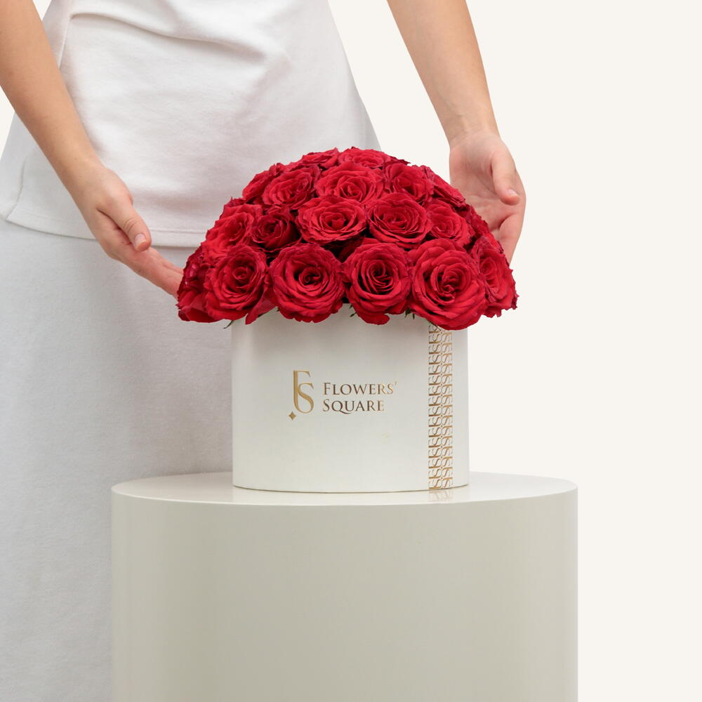 Coffret de roses rouges : une euphorie charmante. Une nouvelle ère en art floral. - 50 roses de qualité supérieure. - Hauteur : 50 cm, largeur : 40 cm