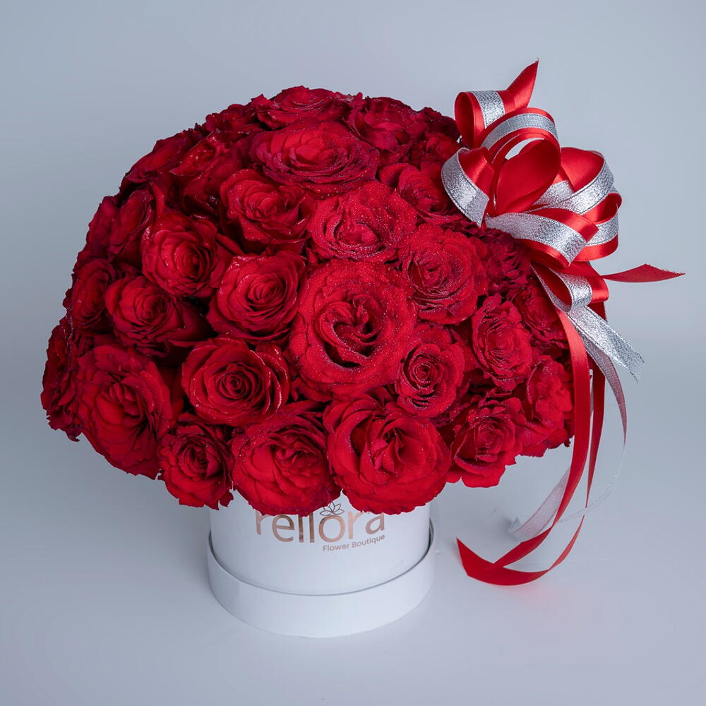 51 roses rouges disposées dans une boîte blanche avec un ruban
