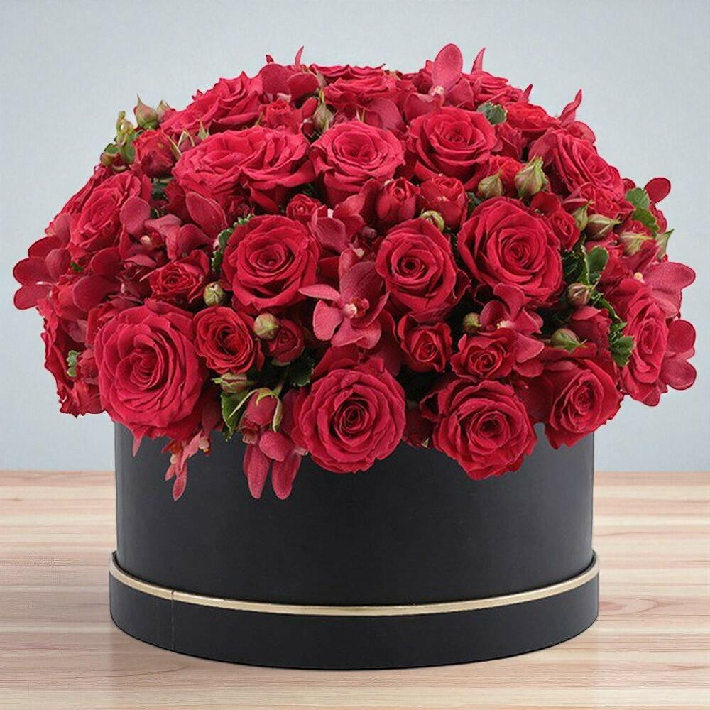 35 ROSES ROUGES 5 MOKARA ET 10 HYPERICUM DANS UNE BOÎTE NOIRE 500 AED