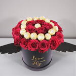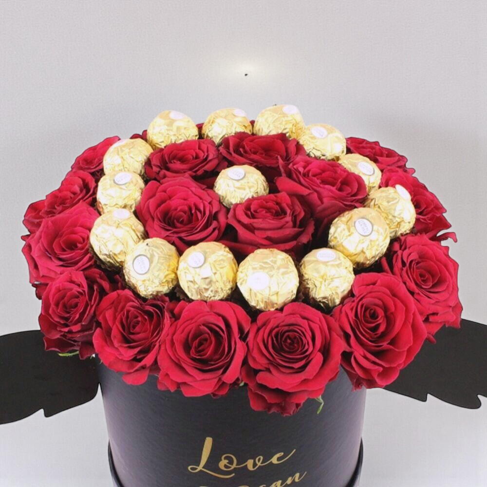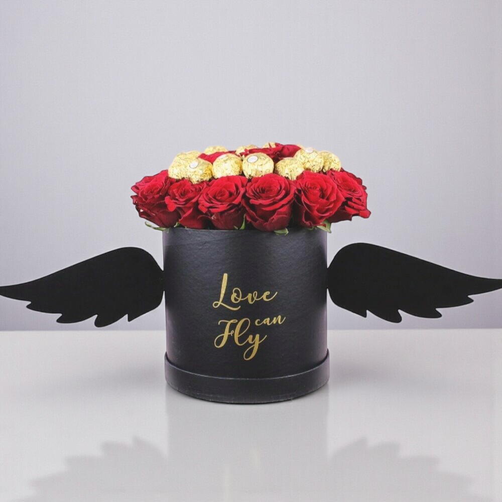 Une combinaison à couper le souffle de passion et d'indulgence, cet arrangement luxueux présente des roses rouge profond élégamment associées à des Ferrero Rocher décadents dans une boîte-cadeau noire et élégante. Les chocolats dorés brillent comme des bijoux au milieu des pétales veloutés, en faisant le cadeau romantique parfait pour les anniversaires, les fêtes d'anniversaire ou toute occasion spéciale. Le design Love Can Fly ajoute une touche fantaisiste, symbolisant un amour sans limites. Conservez l'arrangement dans un endroit frais et sec, à l'abri de la lumière directe du soleil et de la chaleur. Ne réfrigérez pas les chocolats. Brumisez légèrement les fleurs avec de l'eau chaque jour pour maintenir leur fraîcheur. Si l'arrangement contient de la mousse florale, ajoutez une petite quantité d'eau tous les deux jours pour garder les roses hydratées.