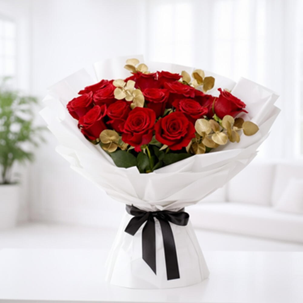 Un bouquet saisissant de roses rouges vives rehaussé d'eucalyptus doré, élégamment enveloppé dans un papier blanc immaculé et terminé par un ruban noir pour une touche raffinée et luxueuse.