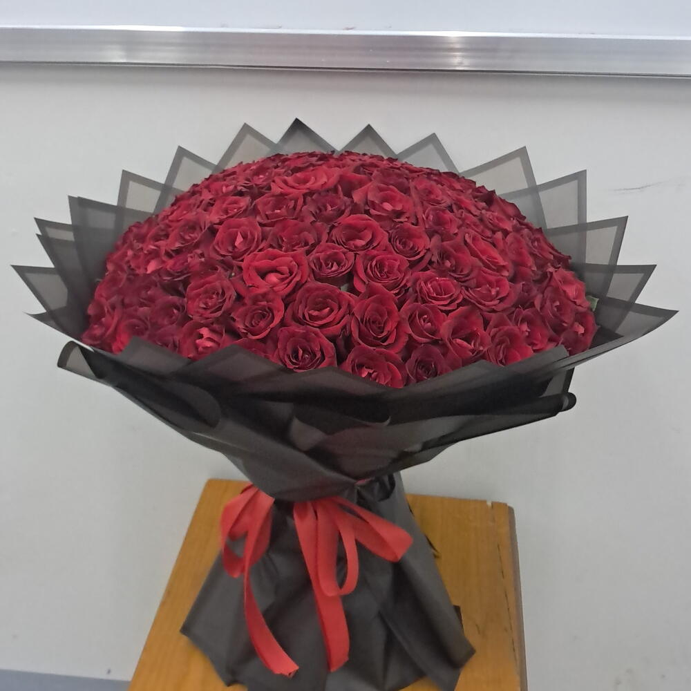 Offrez-vous la beauté à couper le souffle de notre Mono Bouquet, composé d'une collection extravagante de 101 somptueuses roses rouges élégamment enveloppées dans 10 feuilles de papier d'emballage noir minimaliste. Apportant une touche de sophistication intemporelle, le bouquet est orné d'un ruban rouge classique qui entoure gracieusement les roses, servant ainsi de contraste séduisant avec le rouge éclatant et le noir chic. Ce bouquet incarne le symbole ultime d'un amour passionné et de respect, en faisant un cadeau idéal pour vos êtres chers.