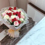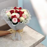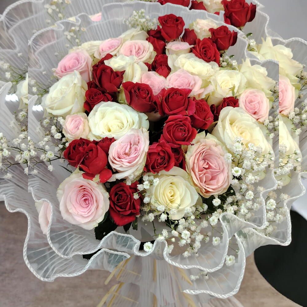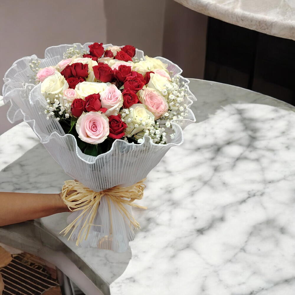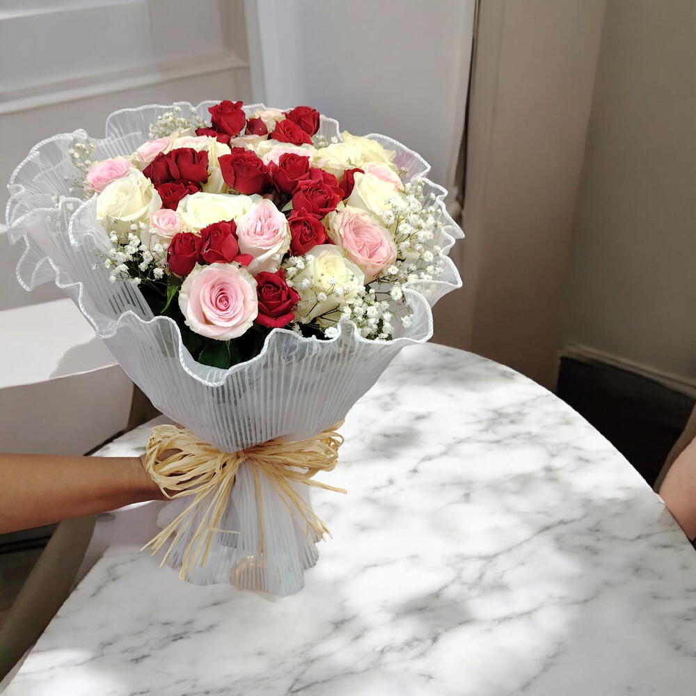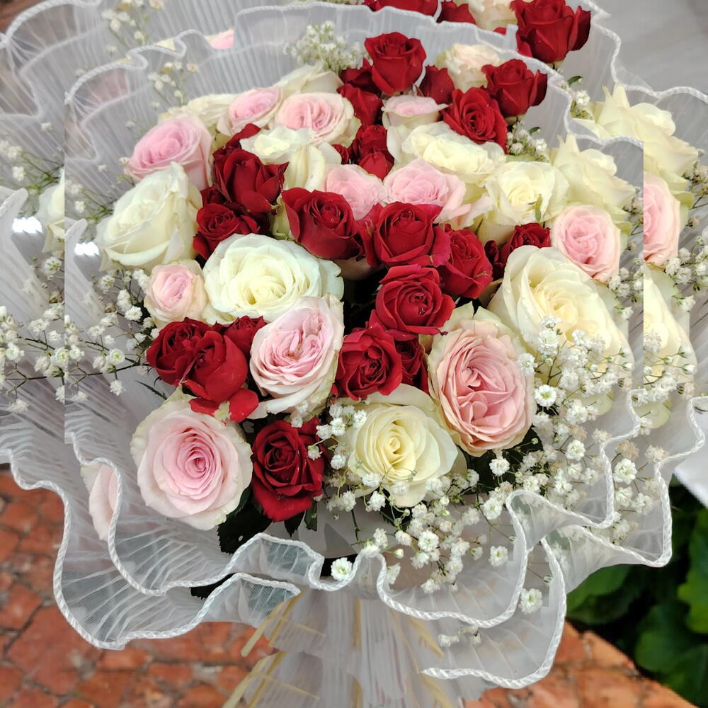 Type de fleurs : Roses fraîches et gypsophile Palette de couleurs : Rouge, ivoire, rose pâle Style de composition : Bouquet champêtre Emballage : Papier blanc translucide avec nœud en raphia Idéal pour : Anniversaire, mariage, fête, occasions romantiques