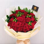 Charmant mariage d'élégance et d'affection, ce bouquet de roses rouges éclatantes et de baies d'hypericum vertes et joyeuses est une façon intemporelle d'exprimer votre amour. Accompagné d'un ourson rouge en peluche tenant un cœur avec l'inscription « Love », ce coffret cadeau est idéal pour les occasions romantiques, les anniversaires ou tout simplement pour égayer la journée de quelqu'un. Le riche contraste de couleurs crée un ensemble à la fois audacieux et gracieux, qui ne manquera pas d'impressionner. Pour prolonger la fraîcheur du bouquet, plongez-le dans de l'eau propre, coupez les tiges en biais tous les deux jours et conservez-le dans un endroit frais, à l'abri de la lumière directe du soleil. Changez l'eau quotidiennement pour prolonger sa beauté.