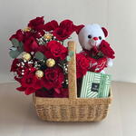 Red rose - 10 pce Basket - 1 pce chocolat Ferrero Rocher - 5 pce petit ours en peluche - 1 pce boîte de 250 grammes de chocolat Patchi - 1 pce
