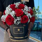 Rose rouge arrangée dans une grande boîte ronde noire