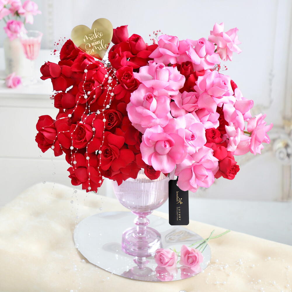 Un mélange poétique de deux teintes préférées, le rouge et le rose. Cet assortiment est conçu pour les envoûter et susciter une réaction d'émerveillement que vous chérirez tous les deux à jamais : roses rose aqua, roses rouges, gypsophile, vase en verre rose, fils de perles et étiquette en acrylique.