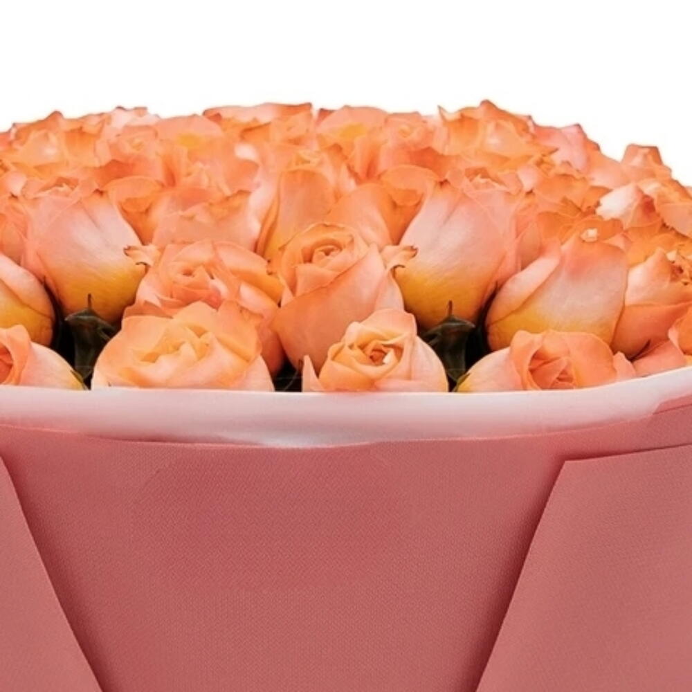 Le bouquet se compose de nombreuses roses fraîches d'un orange clair, probablement autour de 79 tiges, connues pour leurs pétales délicats et leur teinte douce. Les roses orange symbolisent souvent l'admiration, la gratitude et la joie.