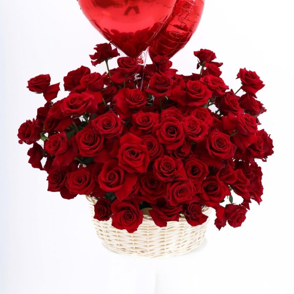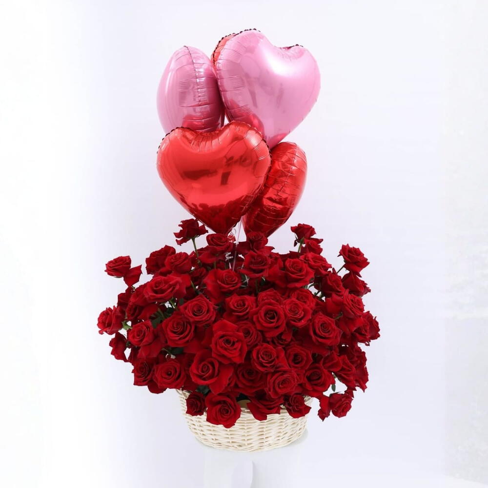 Panier de roses avec ballons