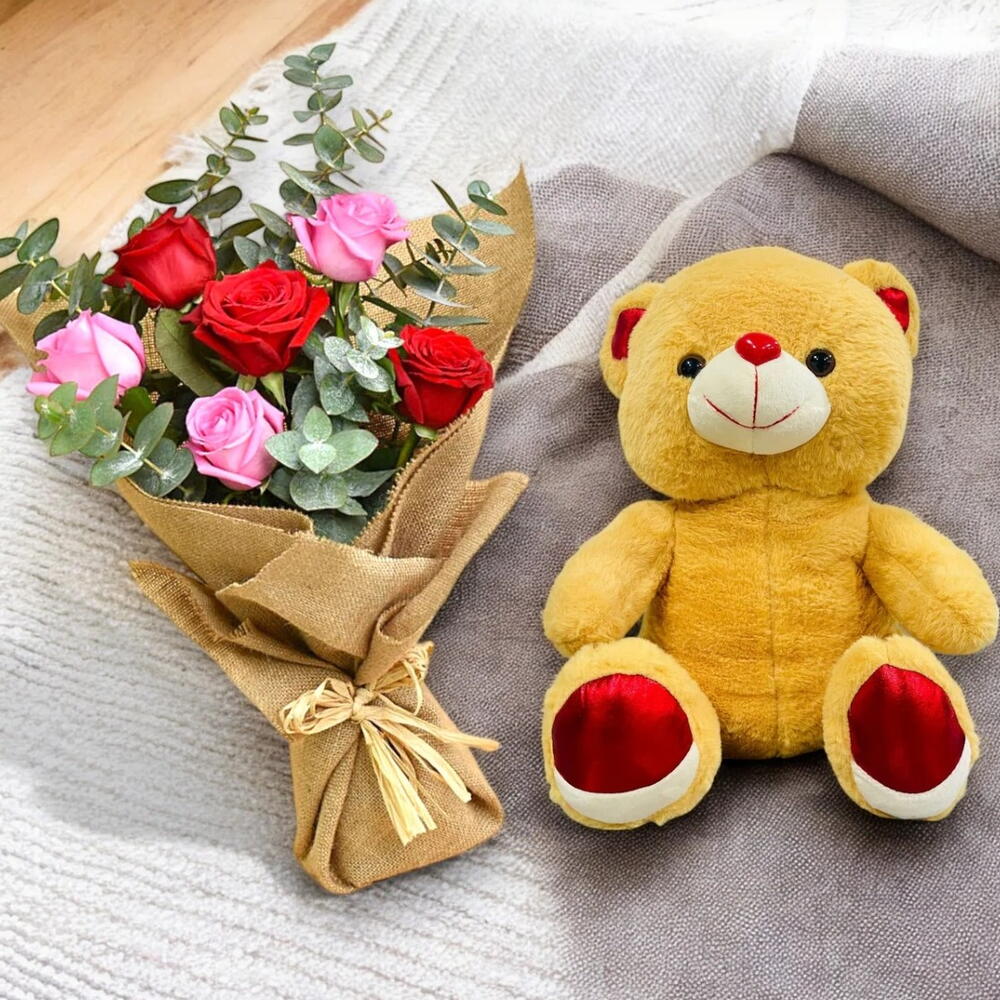 Bouquet de roses avec un ours en peluche