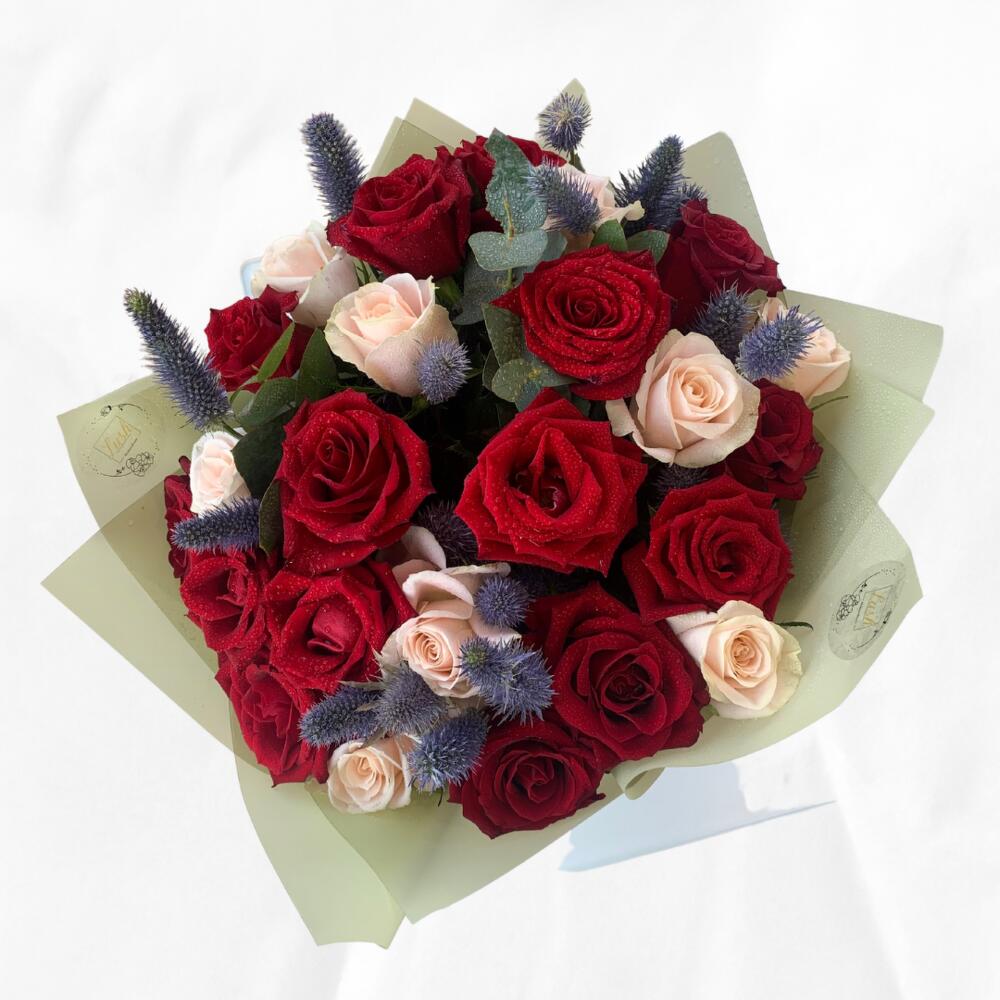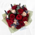 Roses rouges avec une retouche couleur pêche joliment emballées dans du papier vert olive.