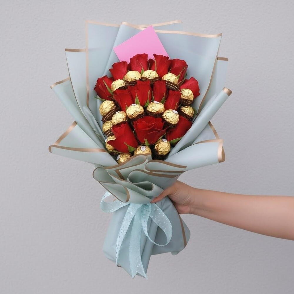 Ce bouquet exquis est une combinaison éblouissante de roses rouges vibrantes et de chocolats Ferrero Rocher gourmands, créant un cadeau luxueux pour toute occasion spéciale. Enveloppé dans un élégant papier bleu pastel aux bords dorés, ce bouquet est conçu pour impressionner. Parfait pour les anniversaires, les noces, les gestes romantiques ou tout moment qui mérite d'être célébré. Pour garder les roses fraîches, coupez les tiges en biais et placez-les dans un vase avec de l'eau fraîche. Changez l'eau tous les deux jours et gardez le bouquet à l'écart de la lumière directe du soleil ou de la chaleur. Conservez les chocolats dans un endroit frais et sec pour préserver leur riche saveur et leur texture.