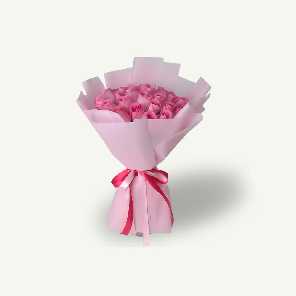 Bouquet noué à la main composé de 25 roses fraîches de couleur rose, délicatement enveloppé dans un papier rose pâle pour une touche douce et romantique.