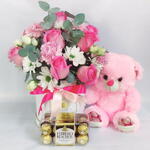 nounours - 1 pce rose - 6 pce fleur blanche - 3 pce ferroro chocolat - 8 pce