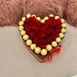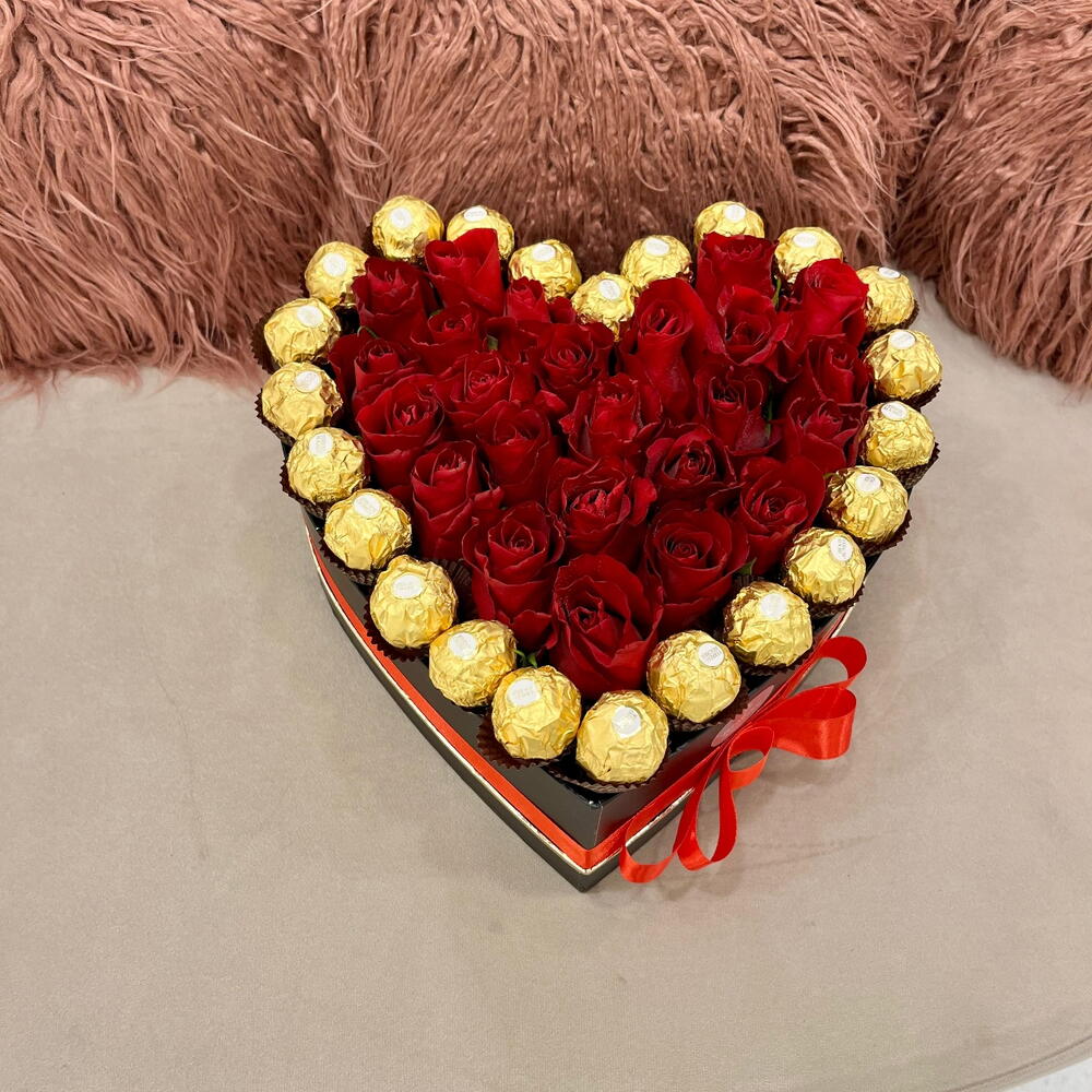 23 roses rouges et 23 chocolats soigneusement disposés dans une élégante boîte en forme de cœur, créant un équilibre parfait entre romance et douceur pour des moments inoubliables.