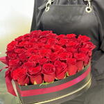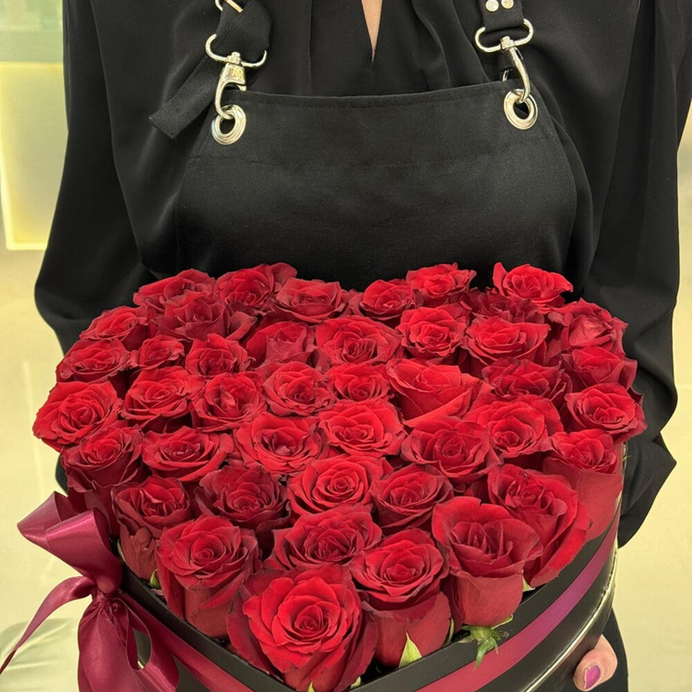 Composition : Rose rouge - 43, boîte - 1. Dimensions : Largeur - 35 cm ; Hauteur - 35 cm ; Longueur - 35 cm (emballage compris). Dimensions : 35 x 35 x 35 cm