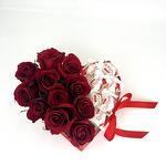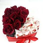 Composition: rose red - 11, Raffaello Chocolate - 7, box - 1, Oasis - 1 Sizes: WIDTH - 20CM; HEIGHT - 9CM; LENGTH - 20CM; (including packaging) Размер: 20 x 9 x 20 см