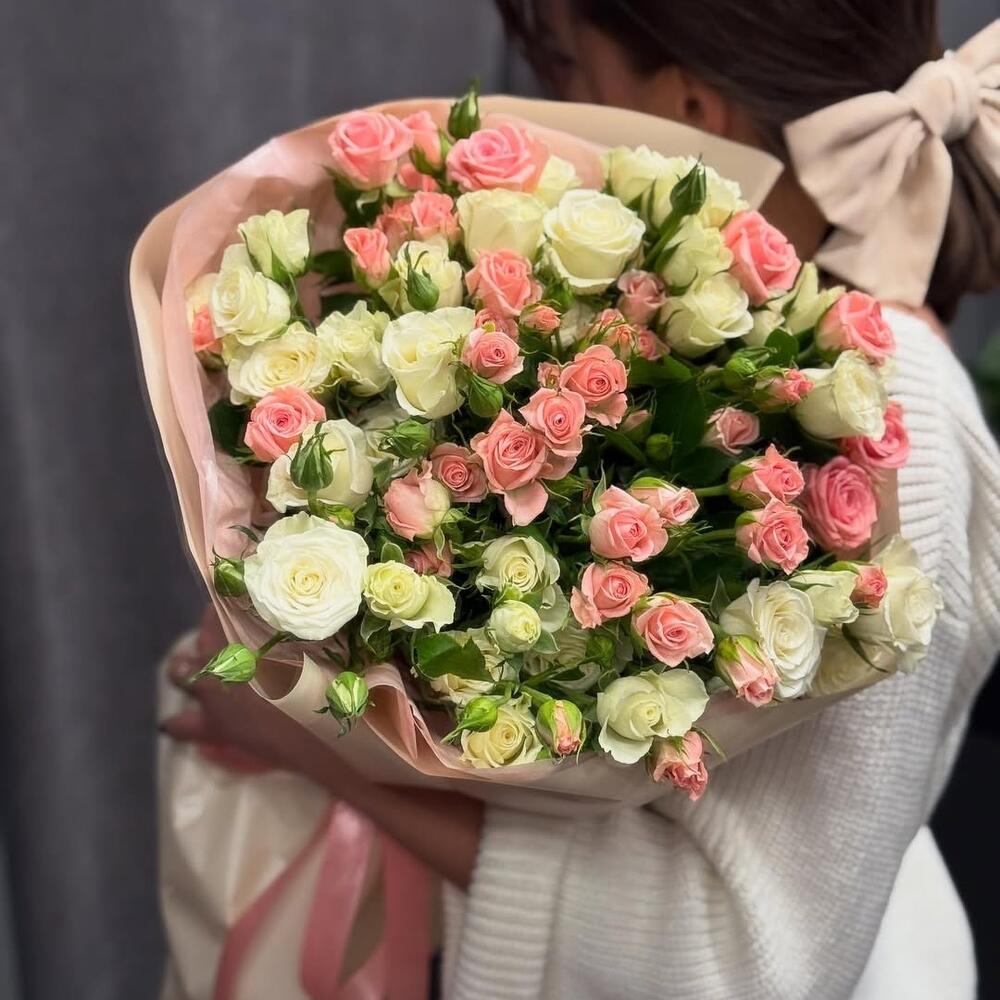 Rosy Haze est un bouquet doux et élégant qui exprime la beauté subtile et l'émotion discrète. Composé de 10 roses blanches immaculées, 10 roses spray blanches et 10 roses spray d'un rose pâle délicat, cet arrangement allie pureté et romantisme délicat. Le mélange de blancs crémeux et de tons rosés doux crée un aspect onirique et éthéré — parfait pour exprimer l'amour, la gratitude ou une affection paisible.
