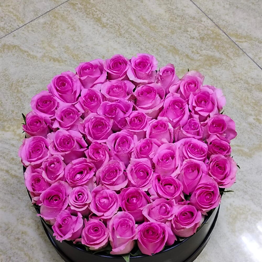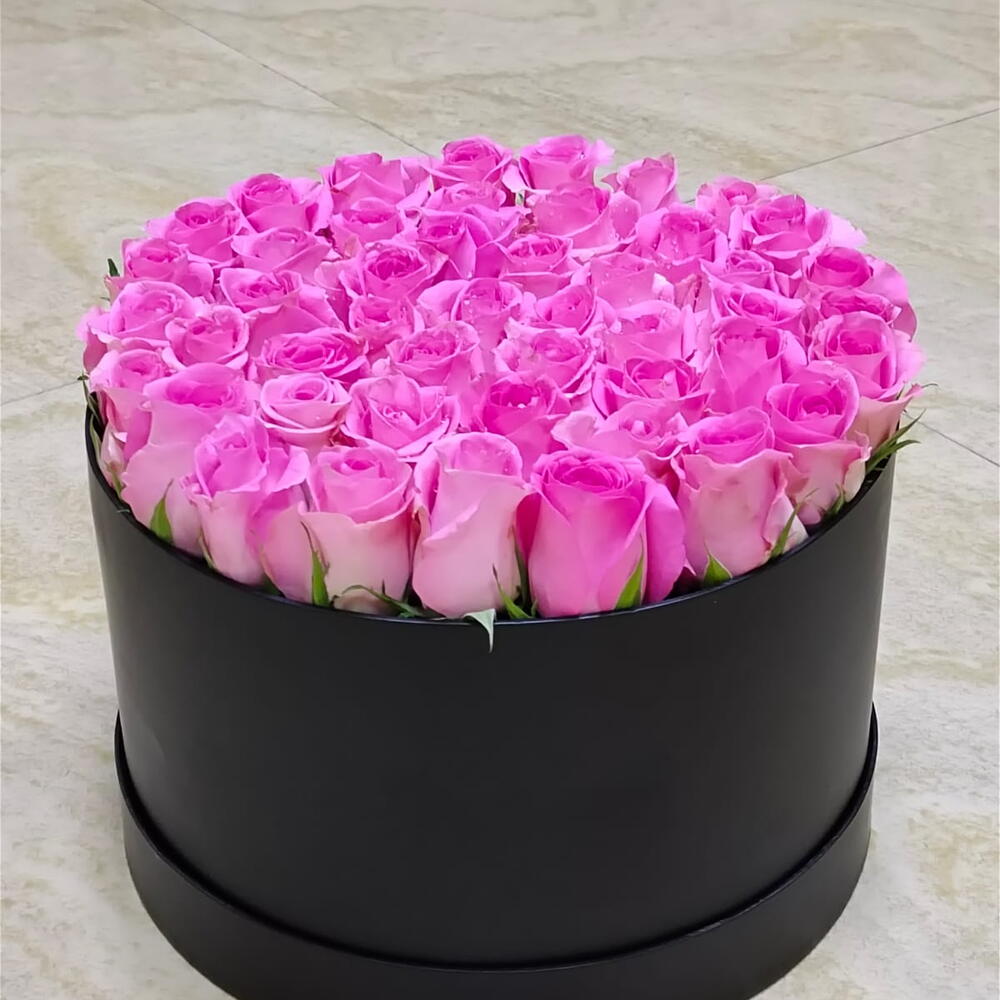 40 tiges de roses roses dans une boîte ronde noire.