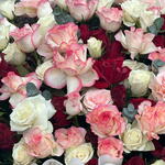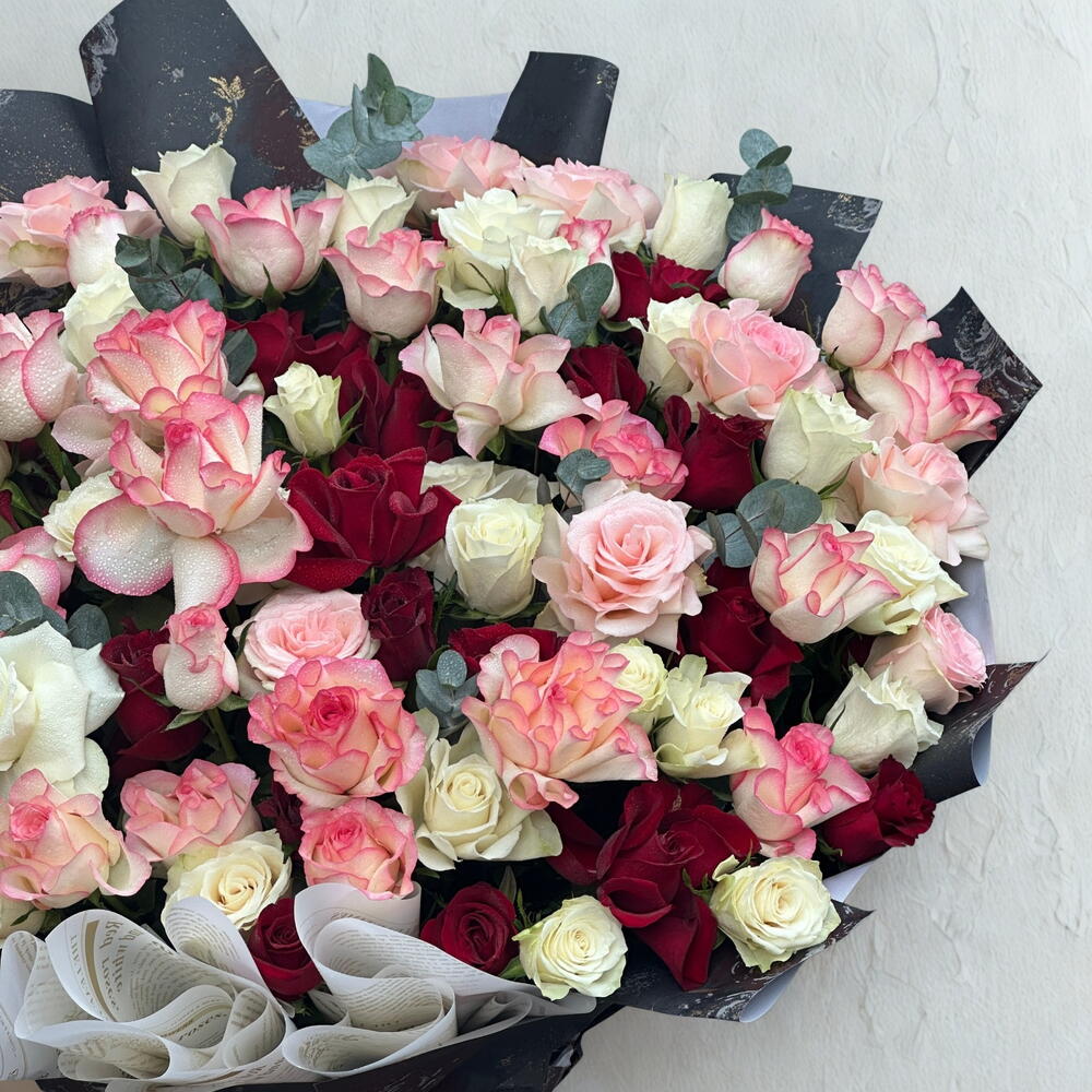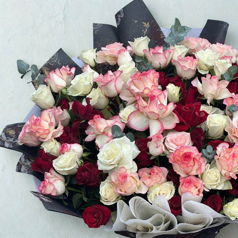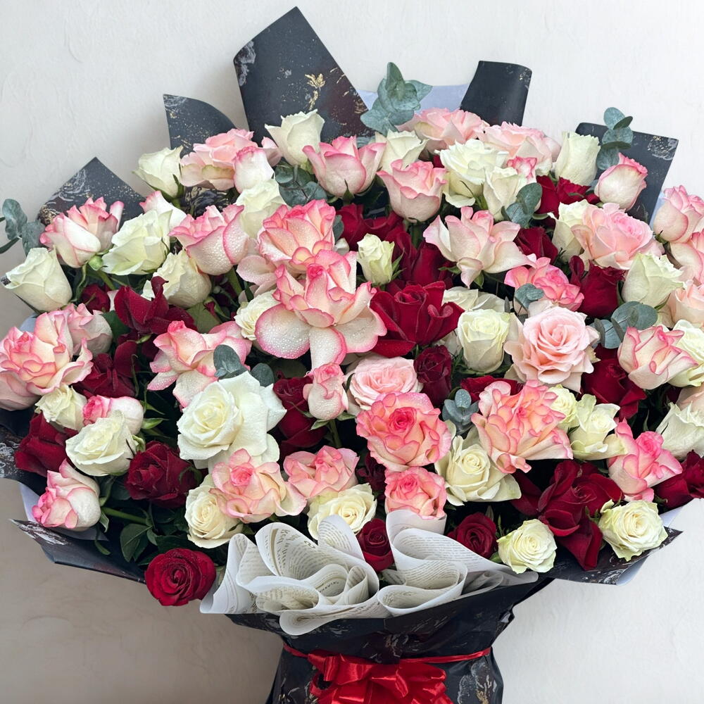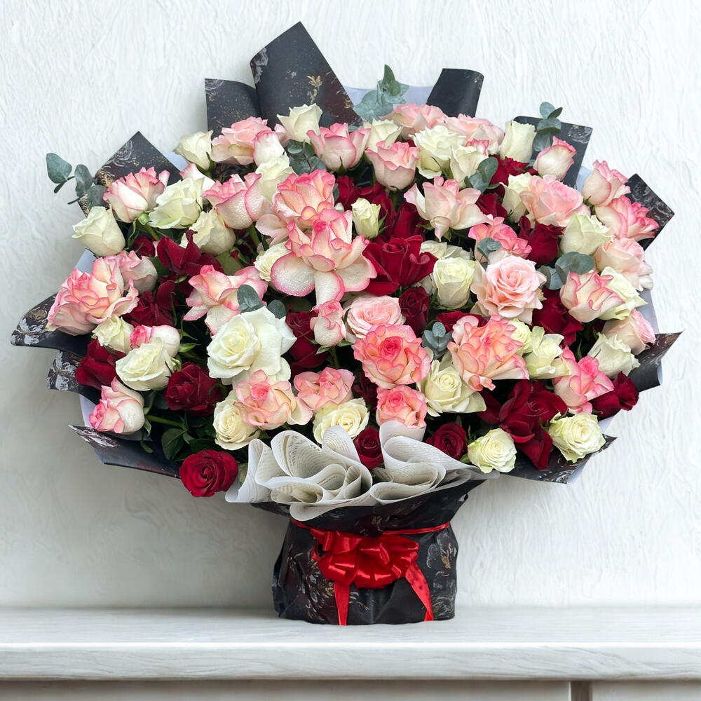 Red rose - 41 pce Ribbon - 1 pce Eucalyptus - 6 pce Pink rose - 30 pce White rose - 30 pce Wrapping - 15 pce
